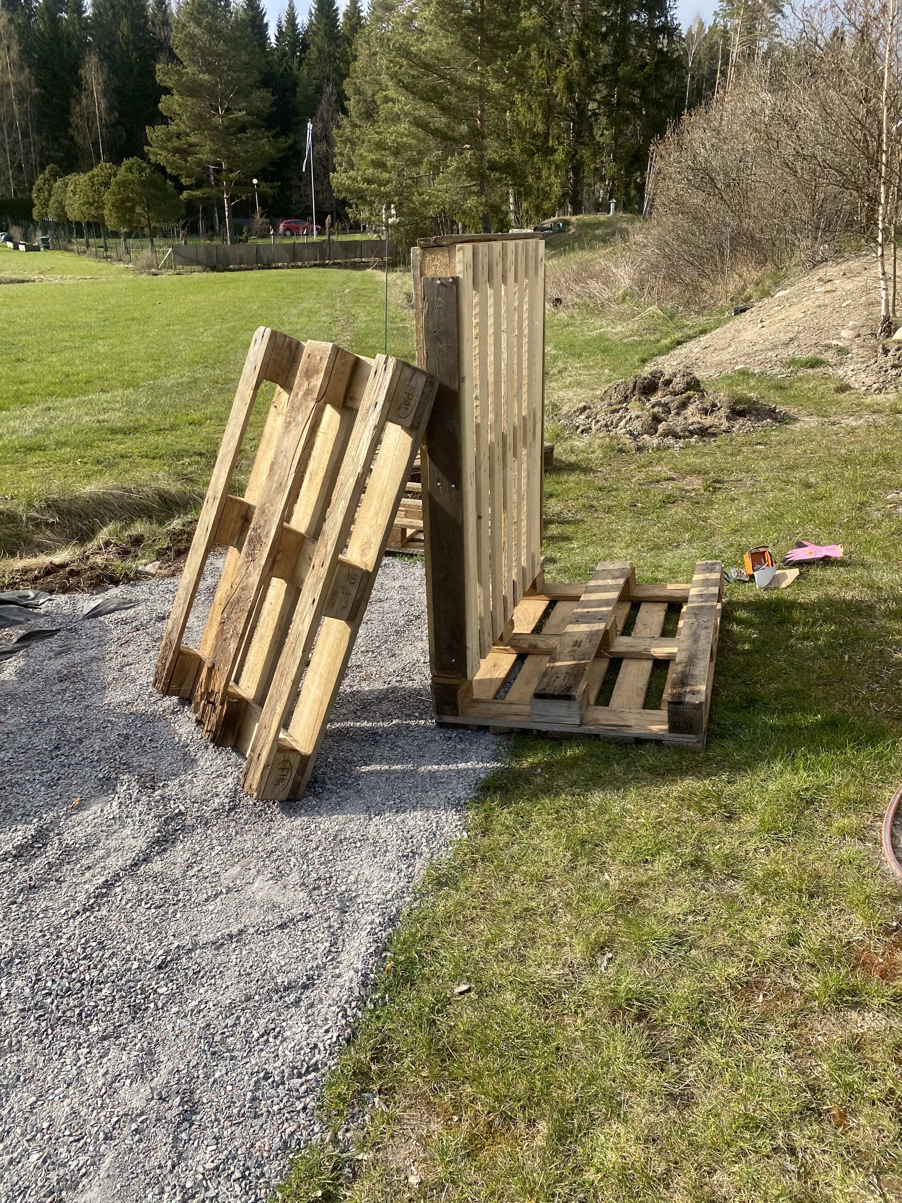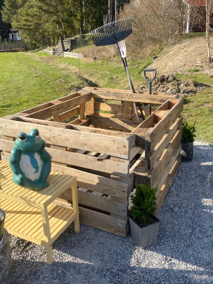 Ni som odlat tomater vet att det blir mycket plockas av ”tjuvar” och att kapa blad. Varje år har det känts som man inte riktigt vet vart kasta det som plockas bort ur växthuset. Stötte på Pinterest på en bra idé hur man kunde använda lastpallar för att snickra ihop en egen ”kompost”. Det blir inte riktigt som en traditionell kompost men något att förvara löv/ogräs i, som med lite tillägg kunde agera som någon form av kompost á la Josephine. Här rekommenderar jag man är två – lastpallarna väger mycket och jag kom igång ensam men sen fick jag nog hjälp av min pappa som är något av en självlärd yrkesman/snickare/allt-i-allo. Så jag kan tyvärr inte ta all kredit för slutprodukten..
