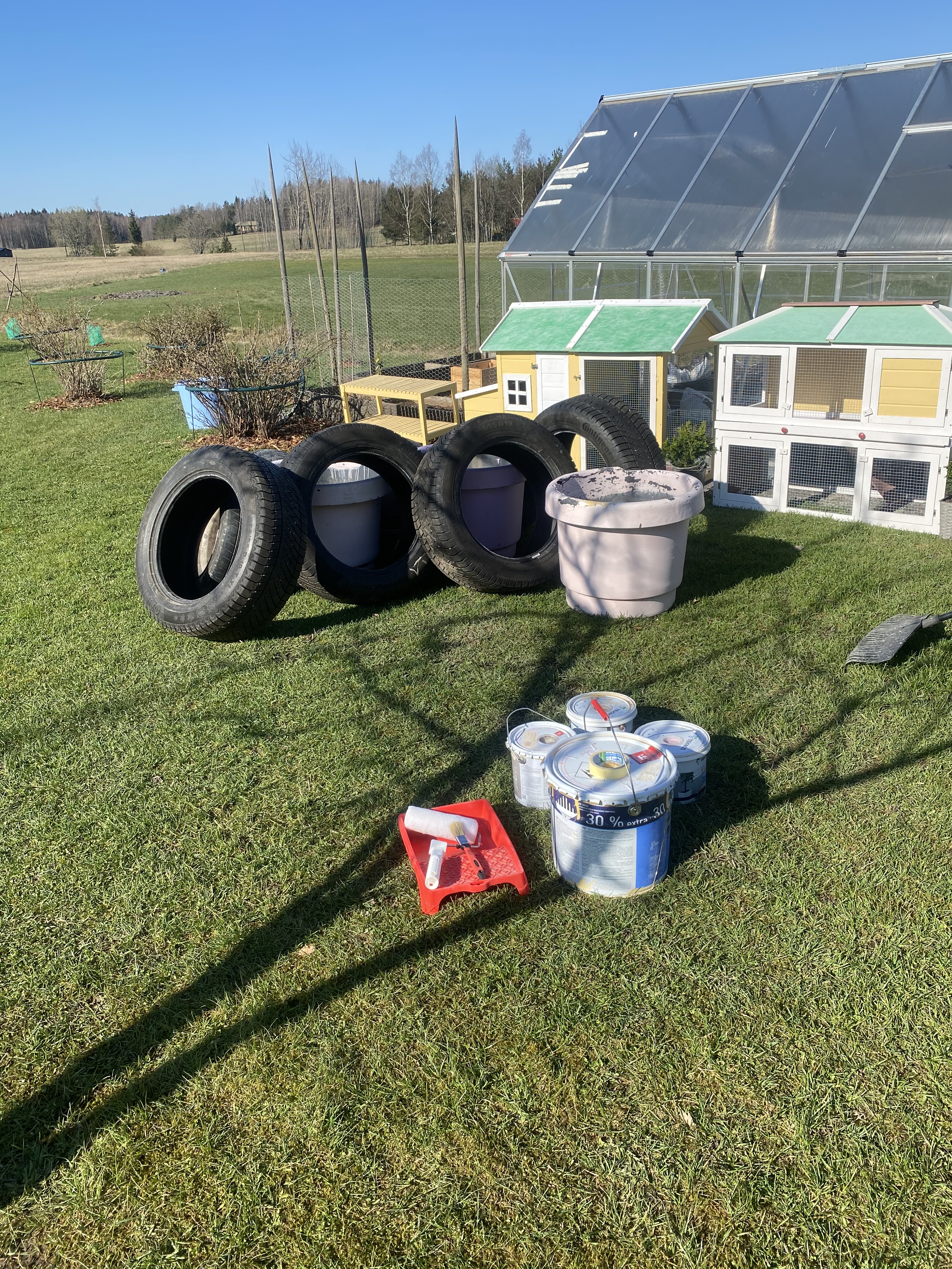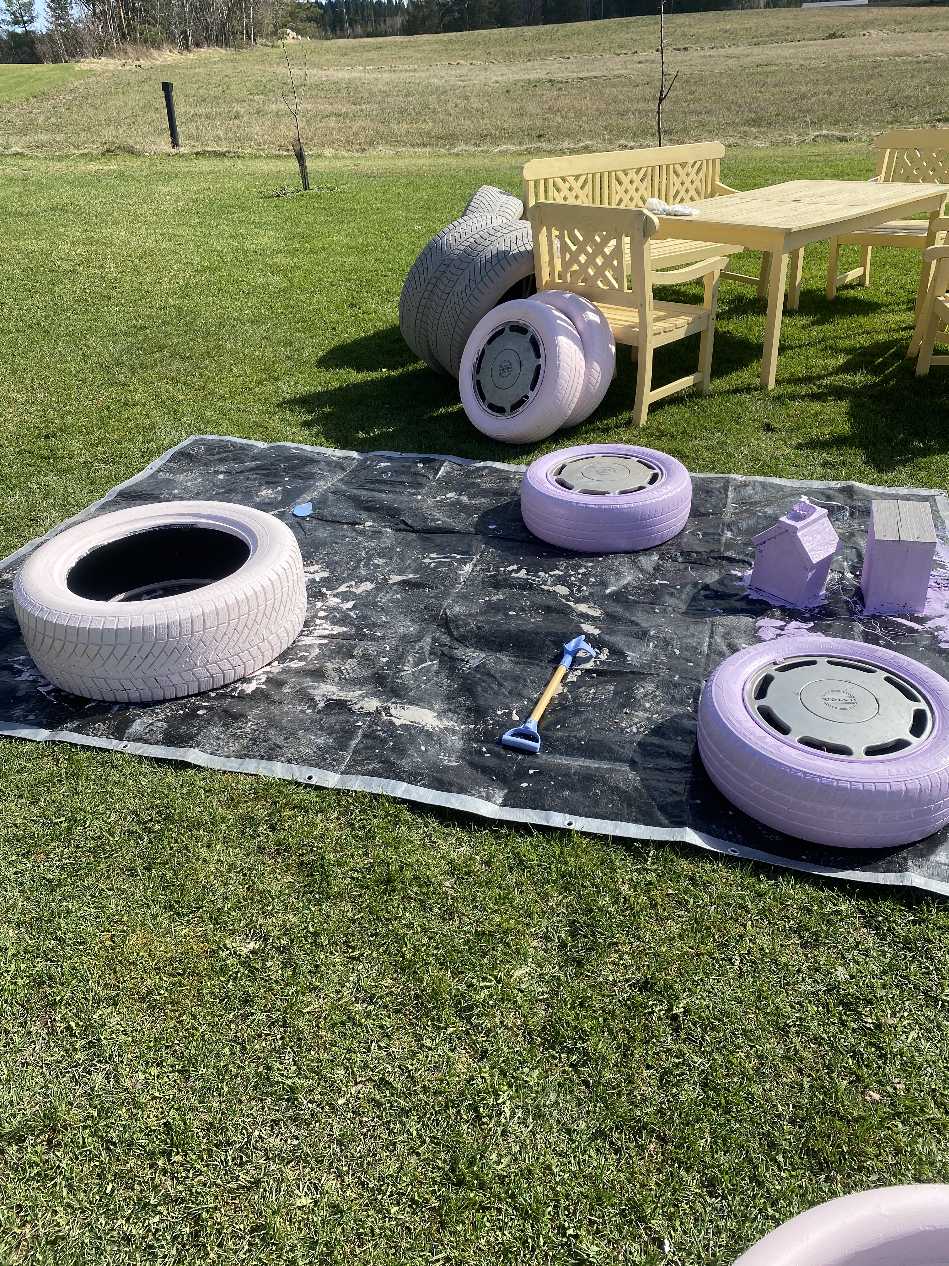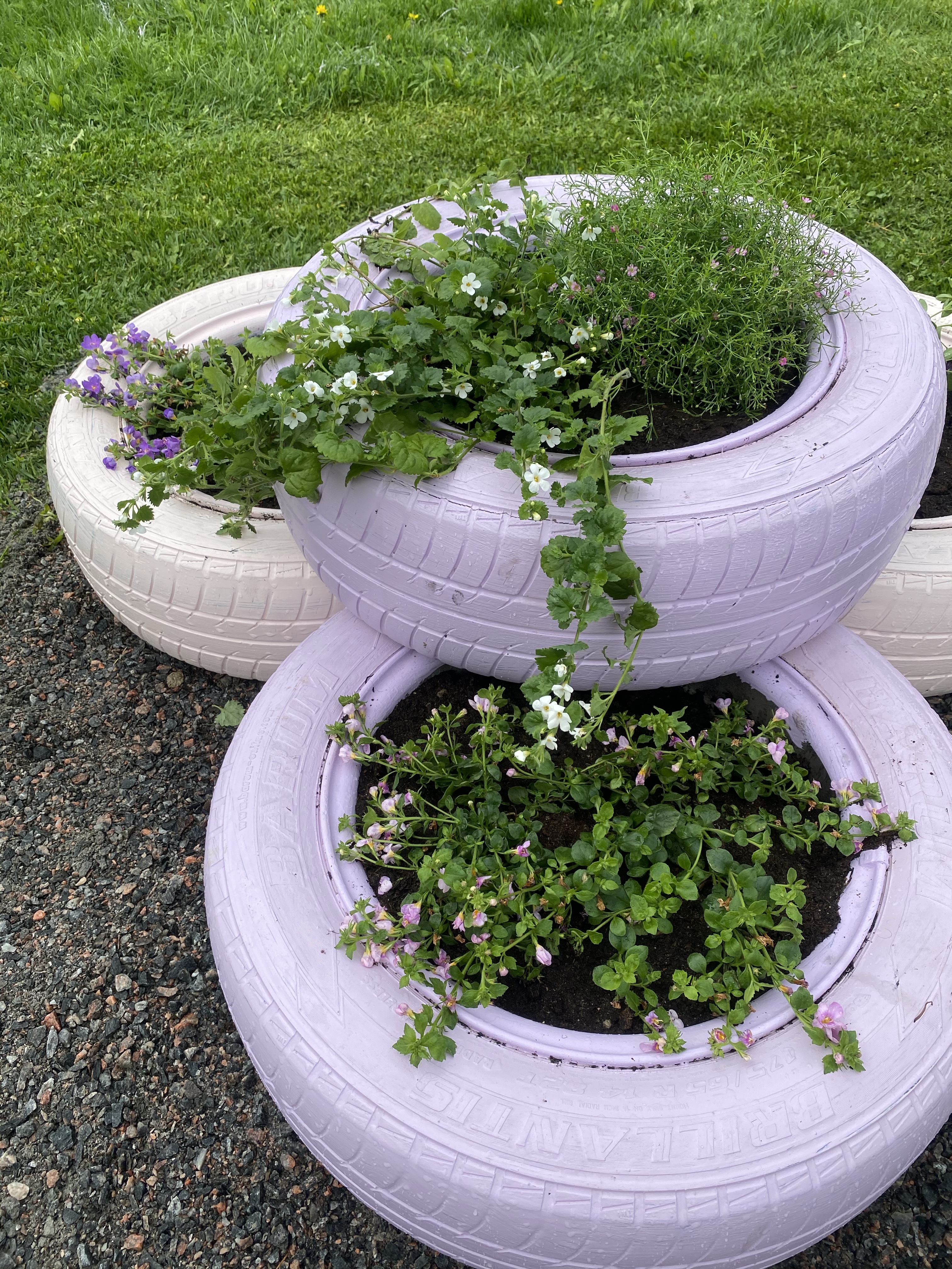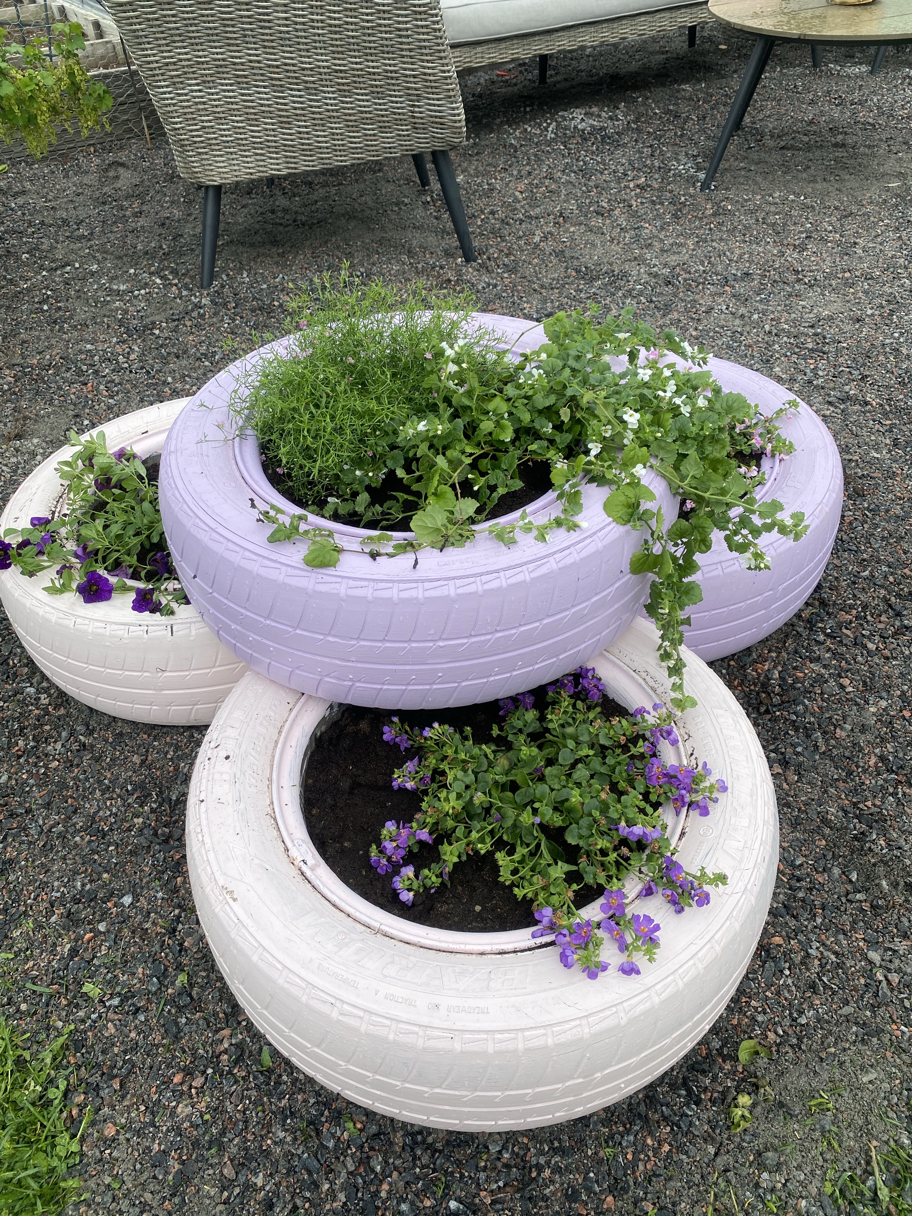 Har du överlopps bilhjul som står i förrådet? Då har du många olika roliga alternativ du kan göra av dem (förutsatt du nu gillar att pynja i trädgården..). Jag tog av målfärg jag hade hemma, som är för utomhusbruk. Inget speciellt på andra sätt. Sen är det bara att ta penseln i handen och sätta igång! Tre av de stora ringarna jag målade i grått kommer att komma till en ”brunn” jag fixar ihop – den får ni se senare! Här ser ni lite av processen som jag började för cirka en månad sedan. Det här var lätt som en plätt, bara se till att ta bort alla större stenar mellan ringarna och tvätta dem innan man slänger målfärg på.