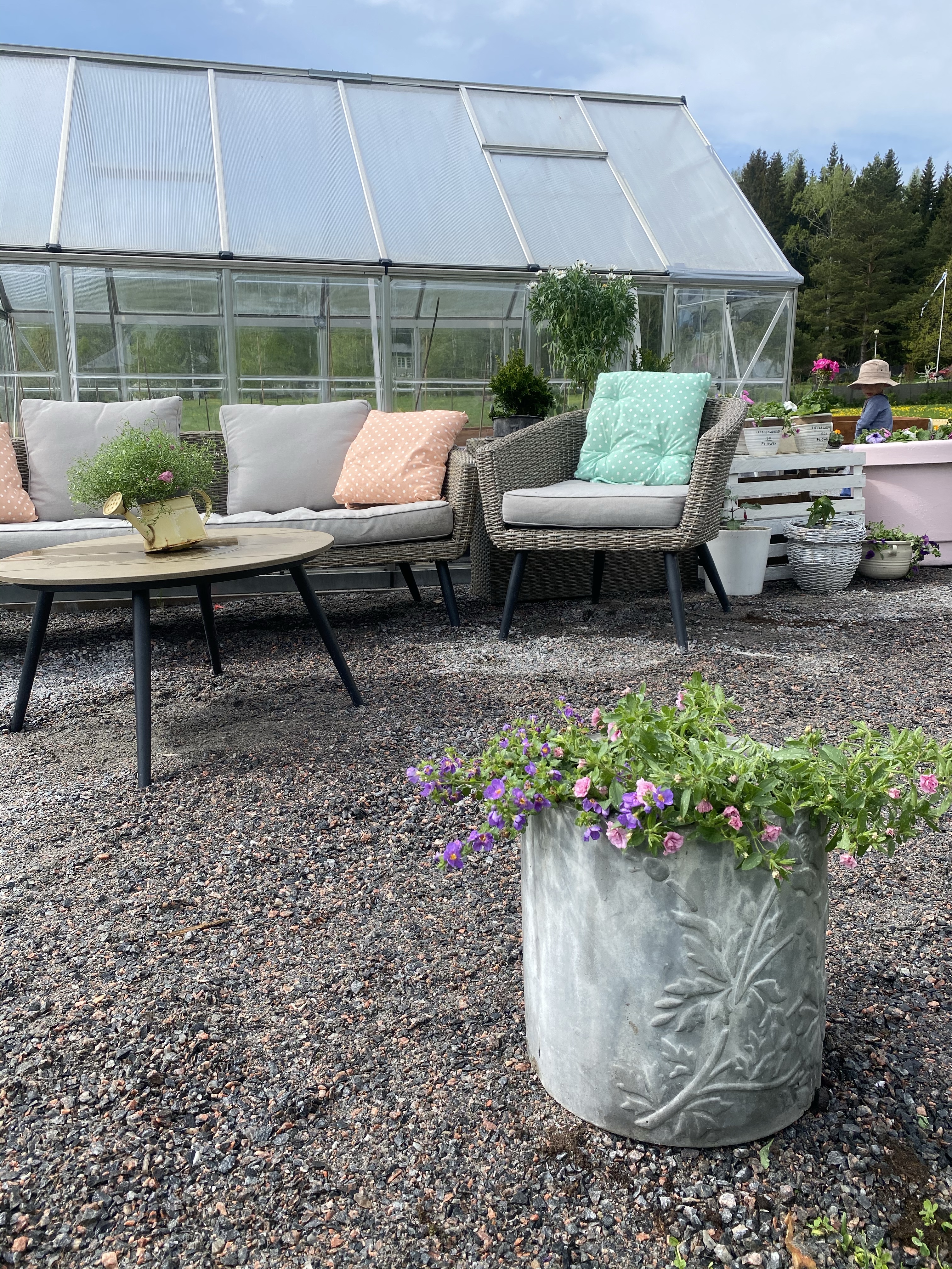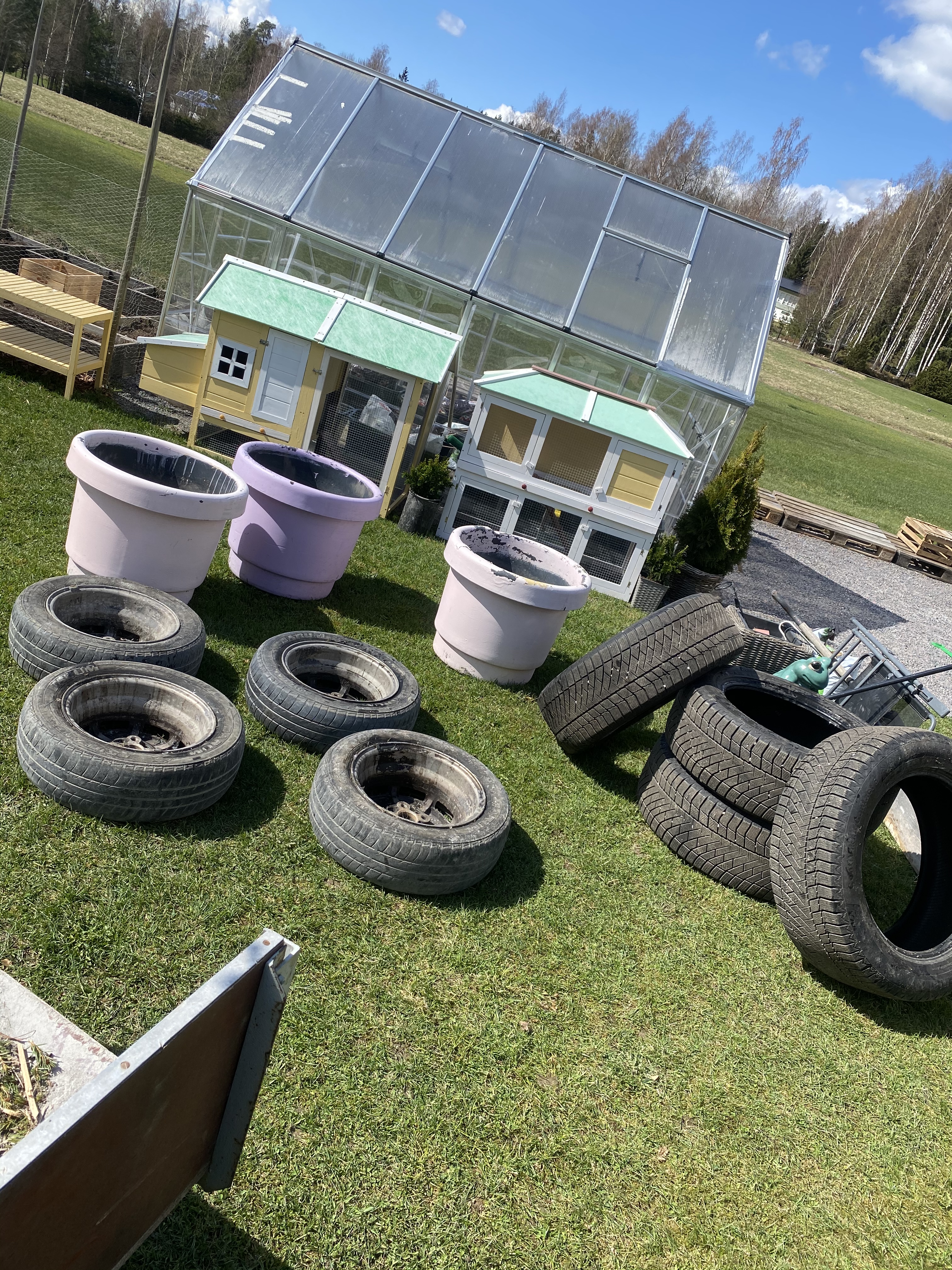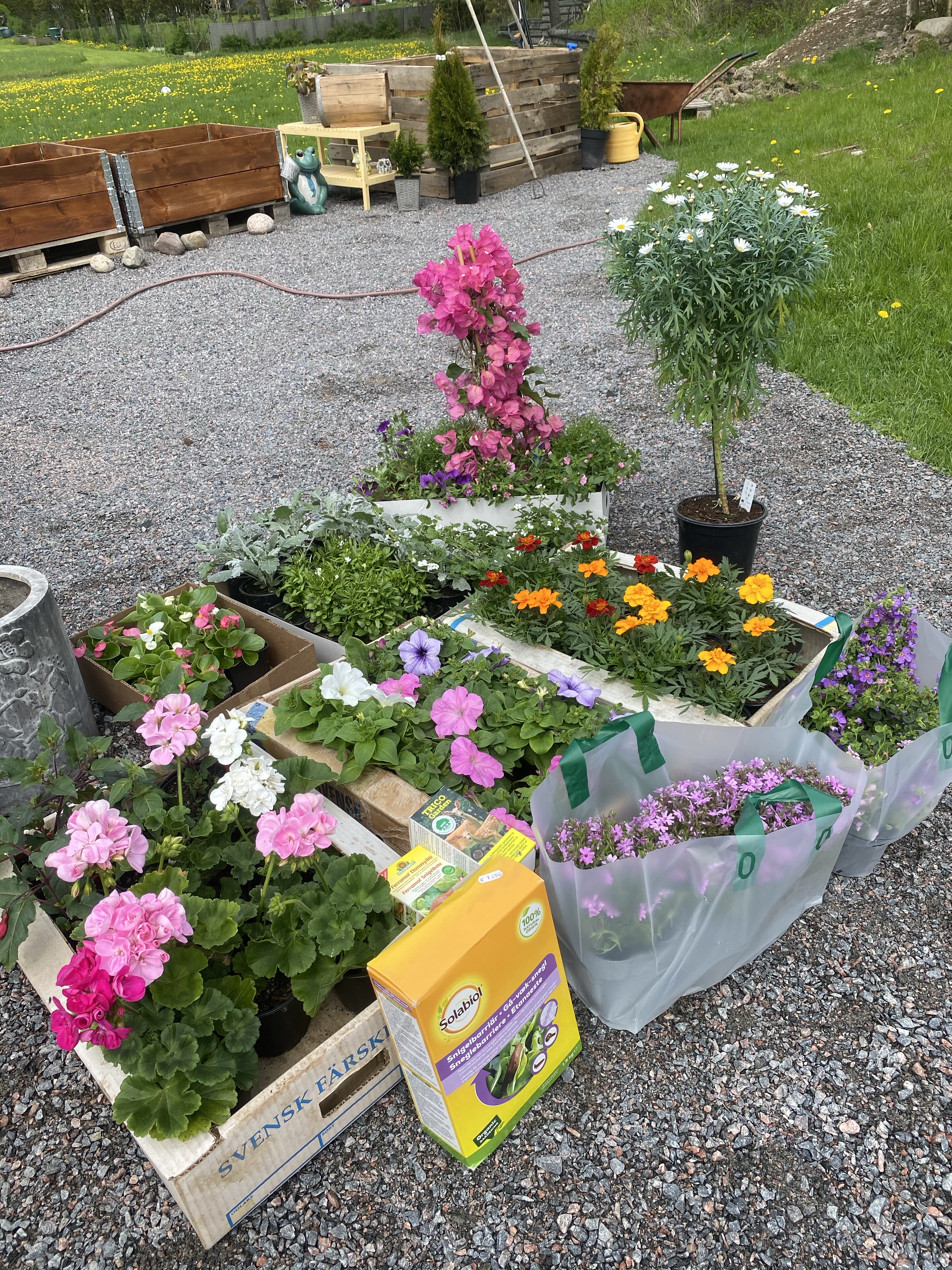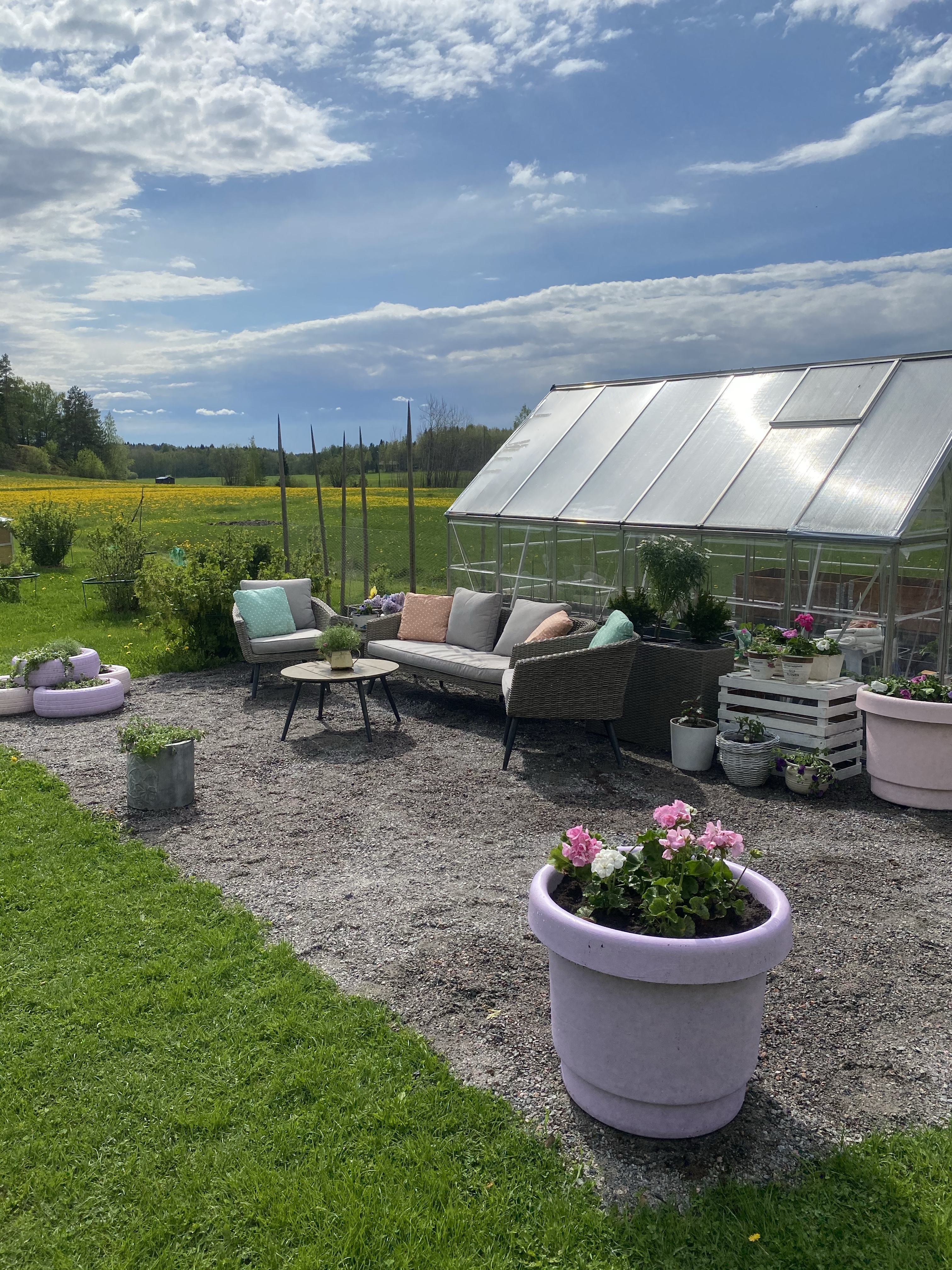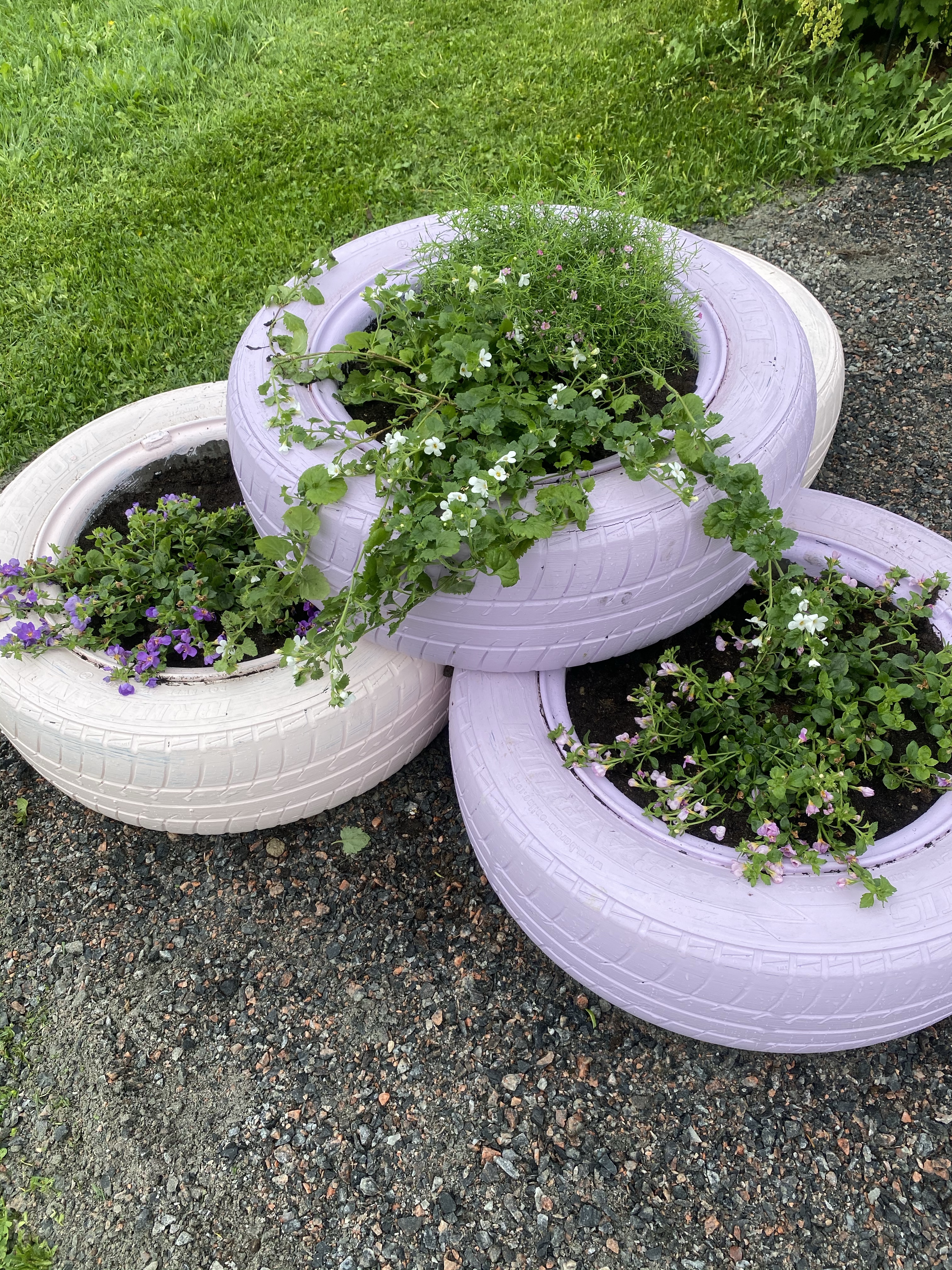 Jag gjorde ju min ”lounge” klar här förra veckan och nu fick den äntligen sommarblommor med, i de fixade bilringarna. Ni kan säkert gissa er till mina favoritfärger – roligt då det finns så många blommor i samma färger. Dessutom hörde jag bina/humlorna surra i träden idag, nu får vi hoppas pollineringen lyckas! Här ser ni nu då färdiga loungen, med mina favoritblommor. Hur länge jag lyckas hålla dem vid liv eller har övervattnat dem återstår att se – här har jag en del att lära mig och ni som kan era blommor kan säkert också se att vissa måste planteras om senare i större område.