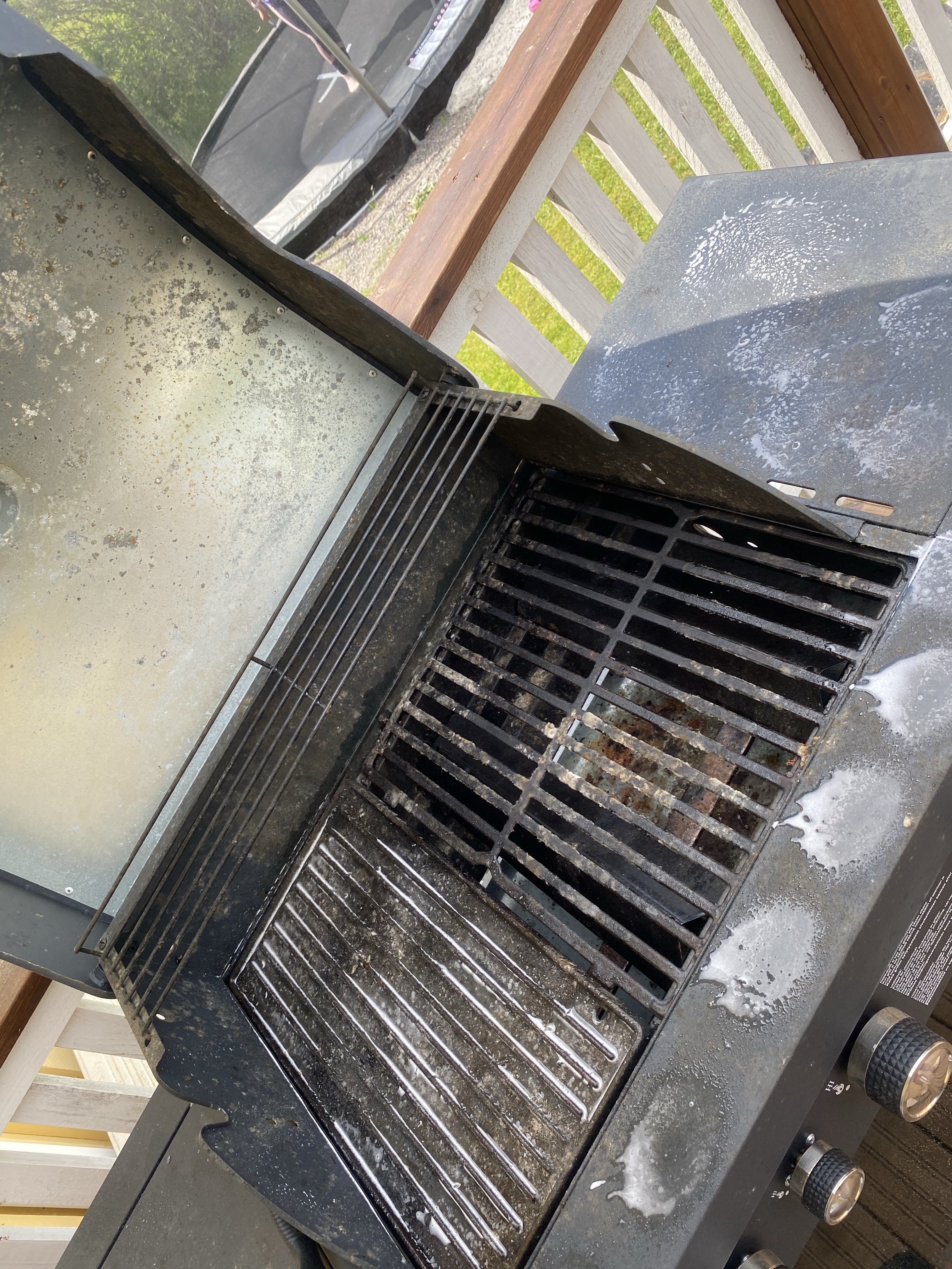 Det finns några hemsysslor som kommer längst ner på listan av saker jag drar mig från att göra och slarvar med – att reda upp byk och sedan att putsa grillen. Dessvärre hade jag glömt putsa grillen ifjol höstas och ni vet ju vad det innebär. Inte alls en rolig överraskning då jag skulle säsongsöppna grillningen. Nu glömde jag ta helt den första värsta bilden före sprayandet, men ni kan säkert föreställa er.