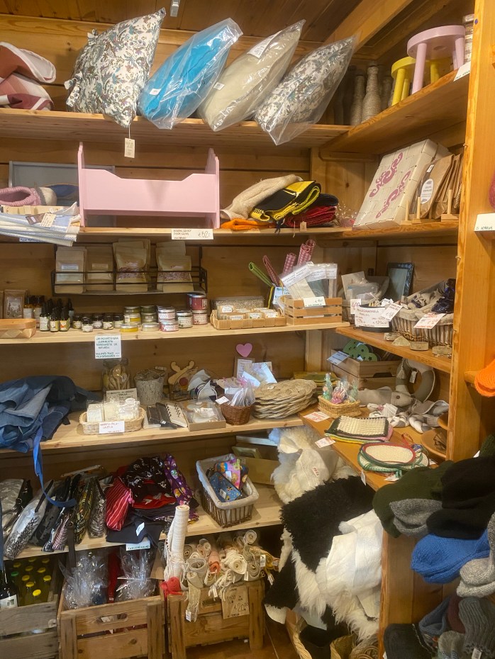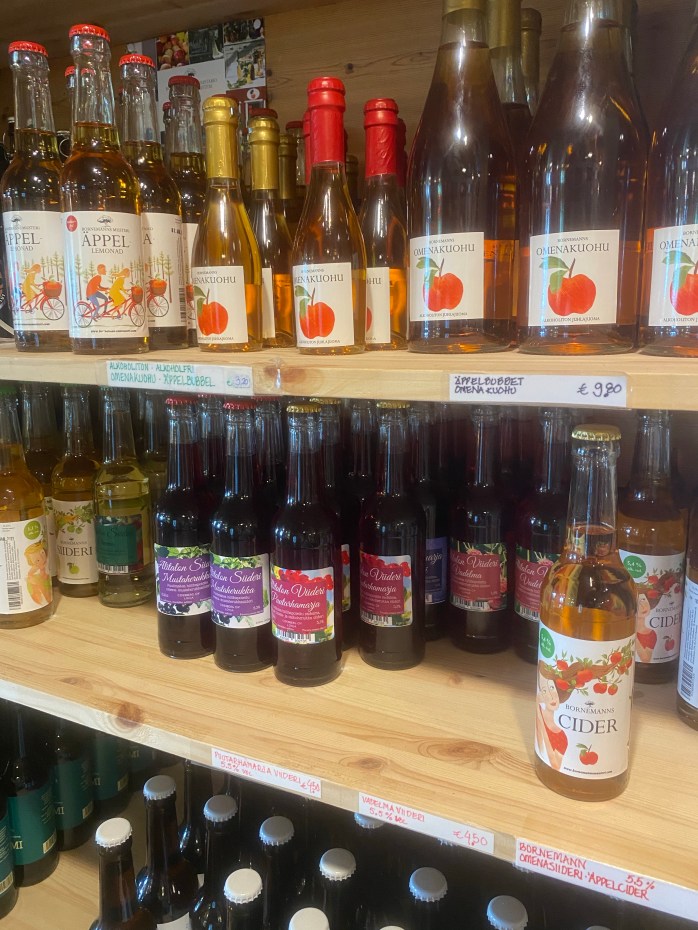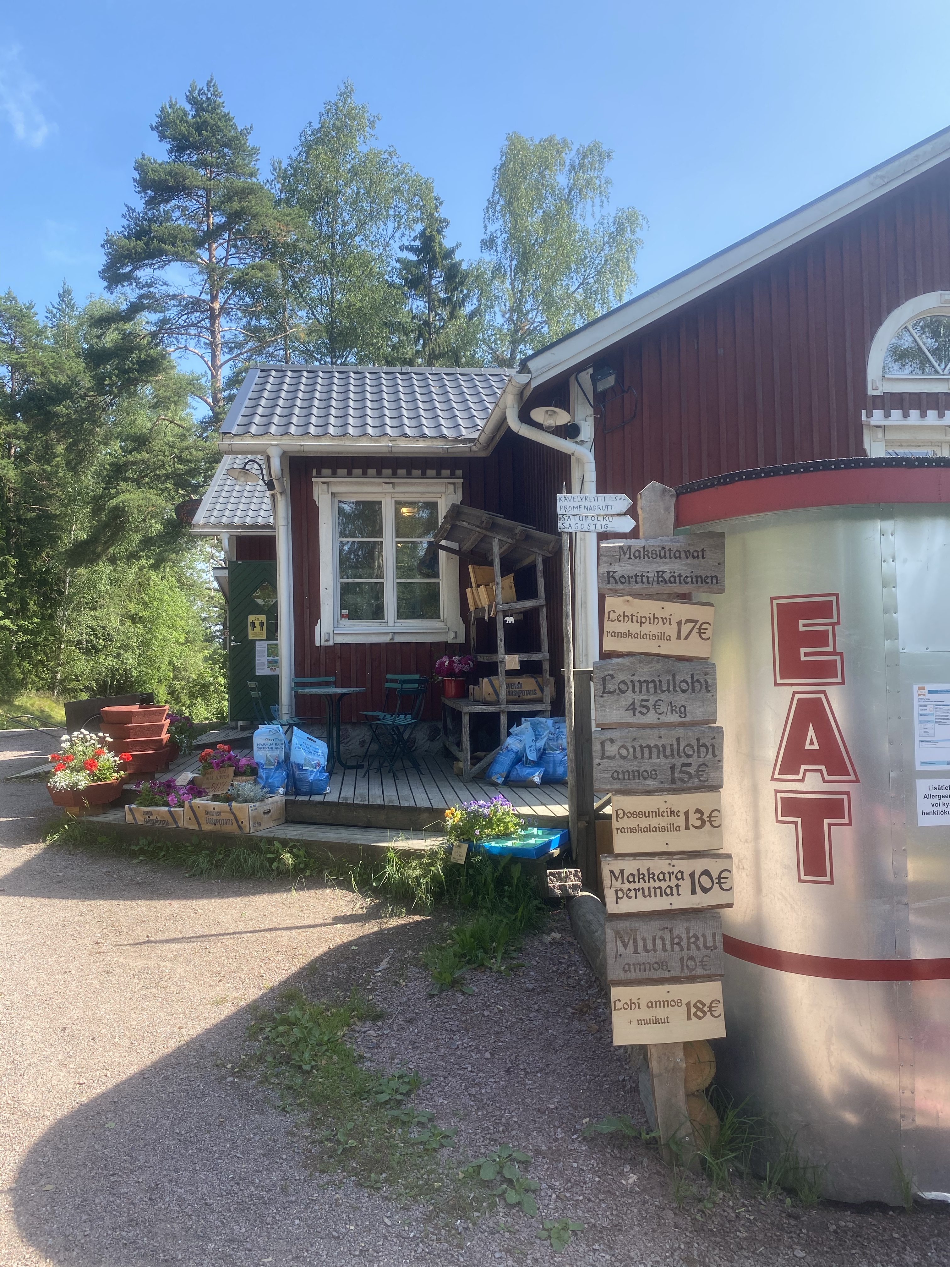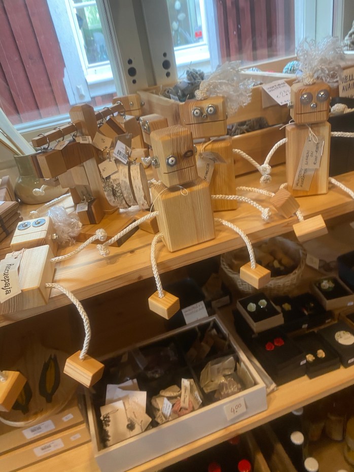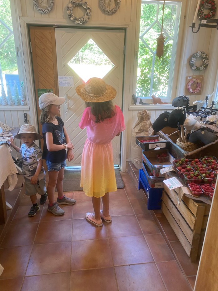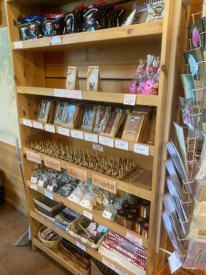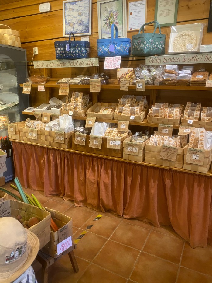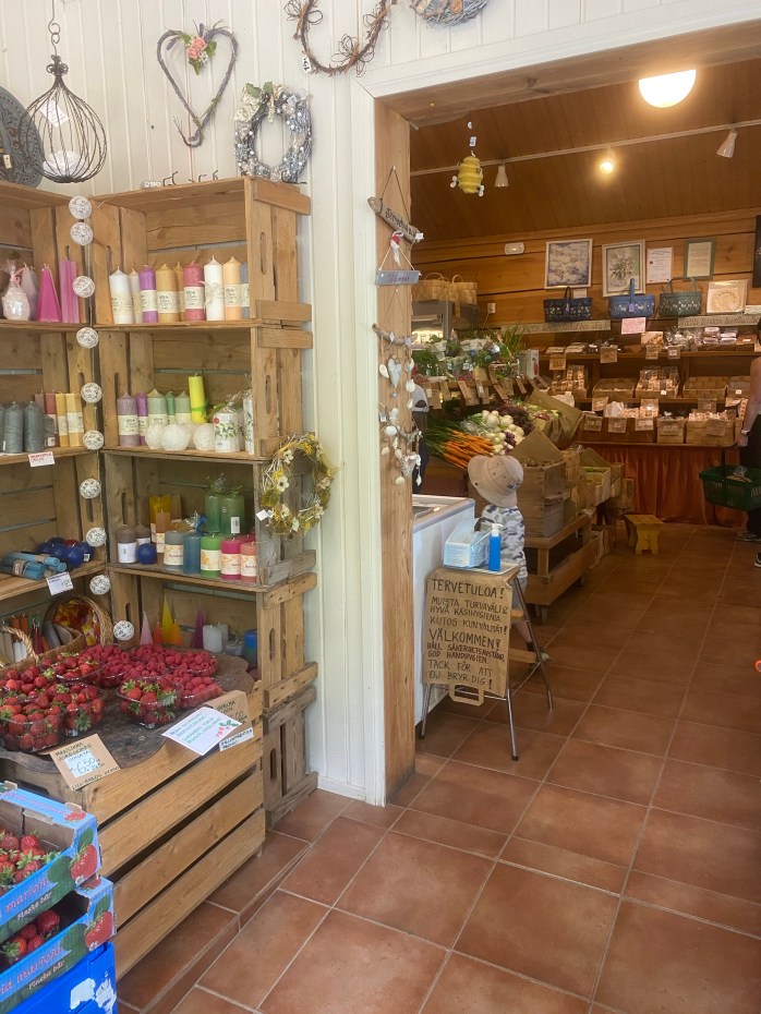 Själva gårdsboden har många underbara varor, både färskvaror och även fina handarbeten av olika hantverkare. Själv fastnade jag för ett par örhängen som såg ut som godis samt några specialgjorda cider passligt till midsommarfirandet. Barnen valde ärter och färska bullar till efterrätt. Men här måste ni kolla in detaljerna, jag skulle kunna lyfta upp så många fina saker – allt från layout, design och varornas upplägg men jag försökte ta så bra bilder som möjligt som illustrerar allt detta. Så vill ni få lite ”maalaisfiilis” (ni får ursäkta min svenska men uttrycket är så tydligt på finska) så skall ni absolut besöka detta ställe. Mer info om Gårdsboden hittar ni här under.