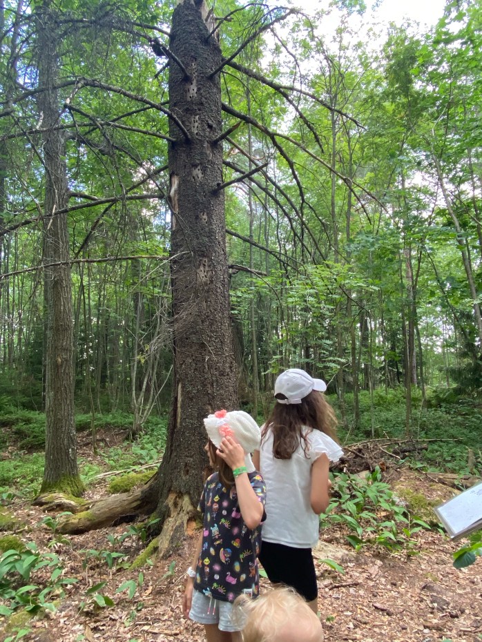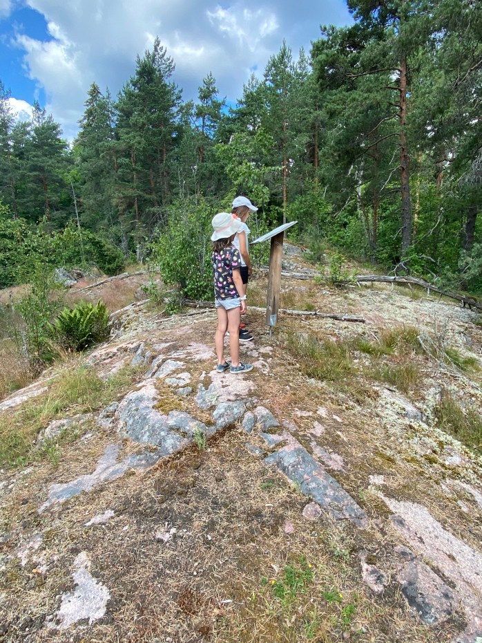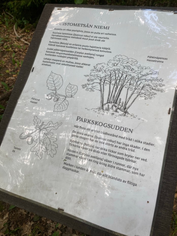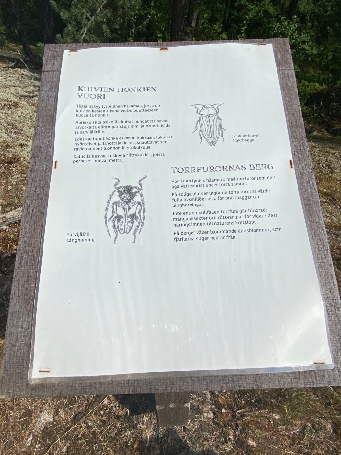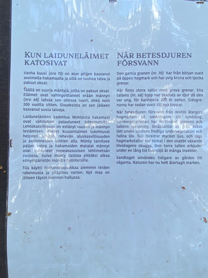 Längs med rutten fanns det info om området eller de olika träd/naturfenomen som fanns att skåda. Tog inte riktigt bild av alla men här följer nu bilder och lite text så ni kan se själva. Men rekommenderar att själv ta promenaden, häftig stig med stor variation. Stigen slutar ju sådär lämpligt vid Wohls café och Wohlsviken (som är en del av sjön Humaljärvi).