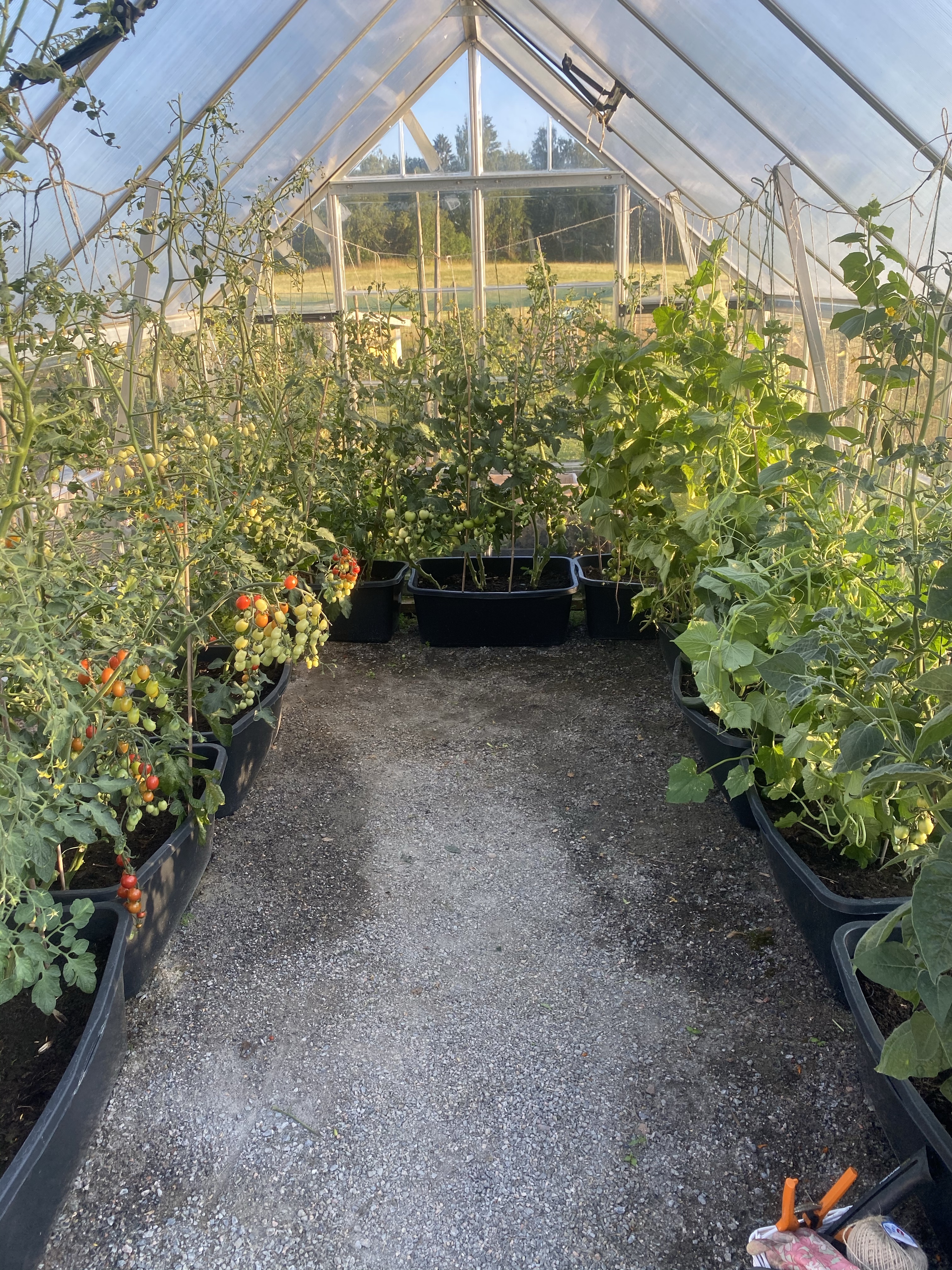 Jag skall inte ljuga och säga det är enkelt att sköta om tomater eller gurkor, det kräver nog en hel del rensande och igår var jag ex. där 1,5h för att rensa, ta bort alla överlopps blad, stjälkar och för att lyfta upp gurkorna så de kan växa fritt och inte bara ligga på marken. För att inte tala om att vattna precis varje dag, minst 1 gång och nu vid hetta ibland även morgon som kväll. Men just nu, denna tid på sommaren är det värt varje sekund! Så funderar ni på att skaffa växthus – tveka inte, gör det! Du kommer få lön för mödan, jag lovar.