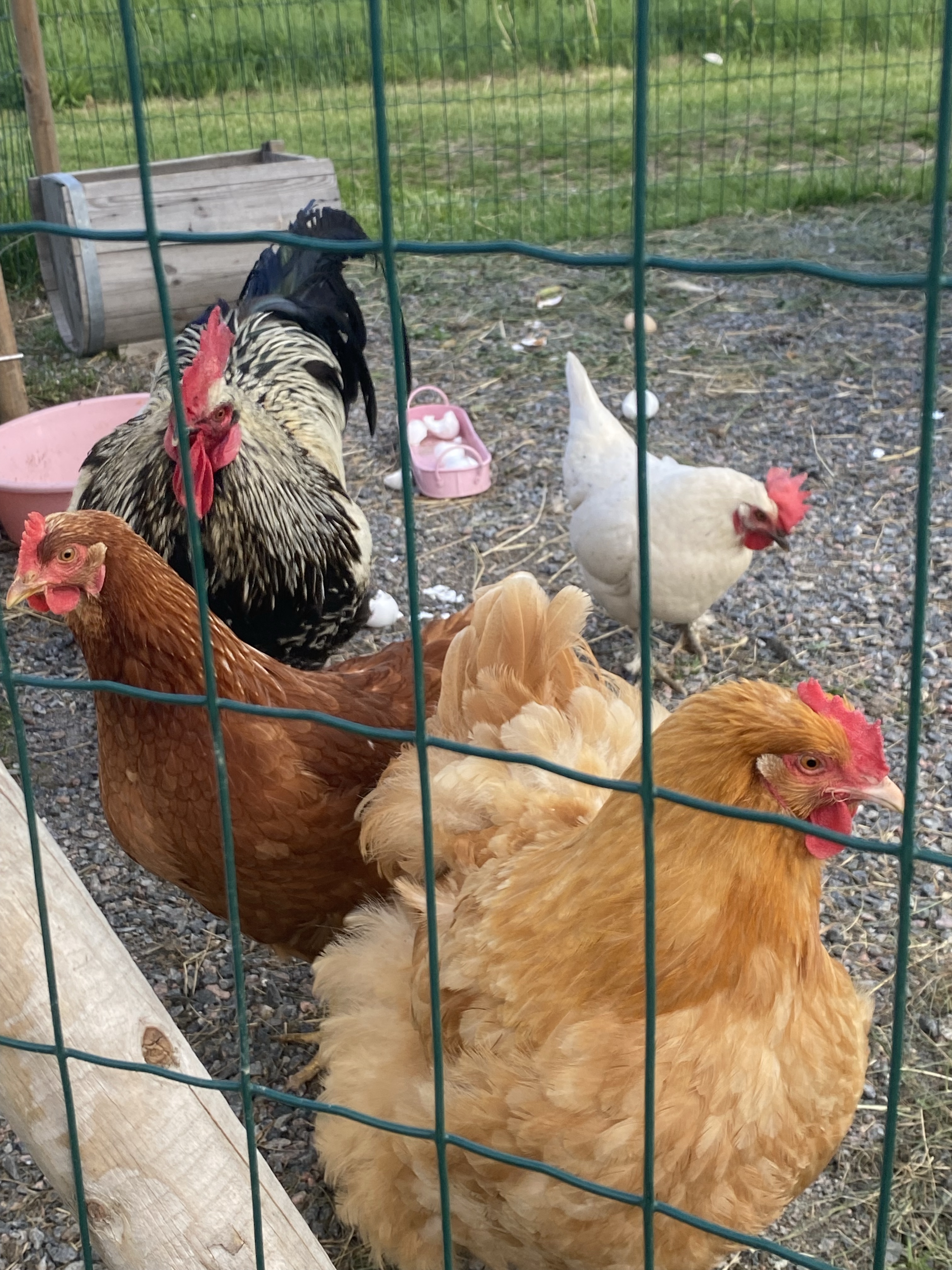 Årets hönor har lite ändrat sen ifjol men tuppen Nemo är densamma. De bruna hönsen brukar vara minst, men som ni ser ovan så en morgon var den ovanligt stor och svaret kom då jag kläckte äggen i stekpannan – där inne fanns ju två äggulor! Kaninerna Morot och Stina kommer bra överens med hönorna och alla gillar de gräs och hönsmat 🙂 Hönorna heter Chicaletta (vita), Daisy (bruna) och Chicken Nugget (ljusbruna).