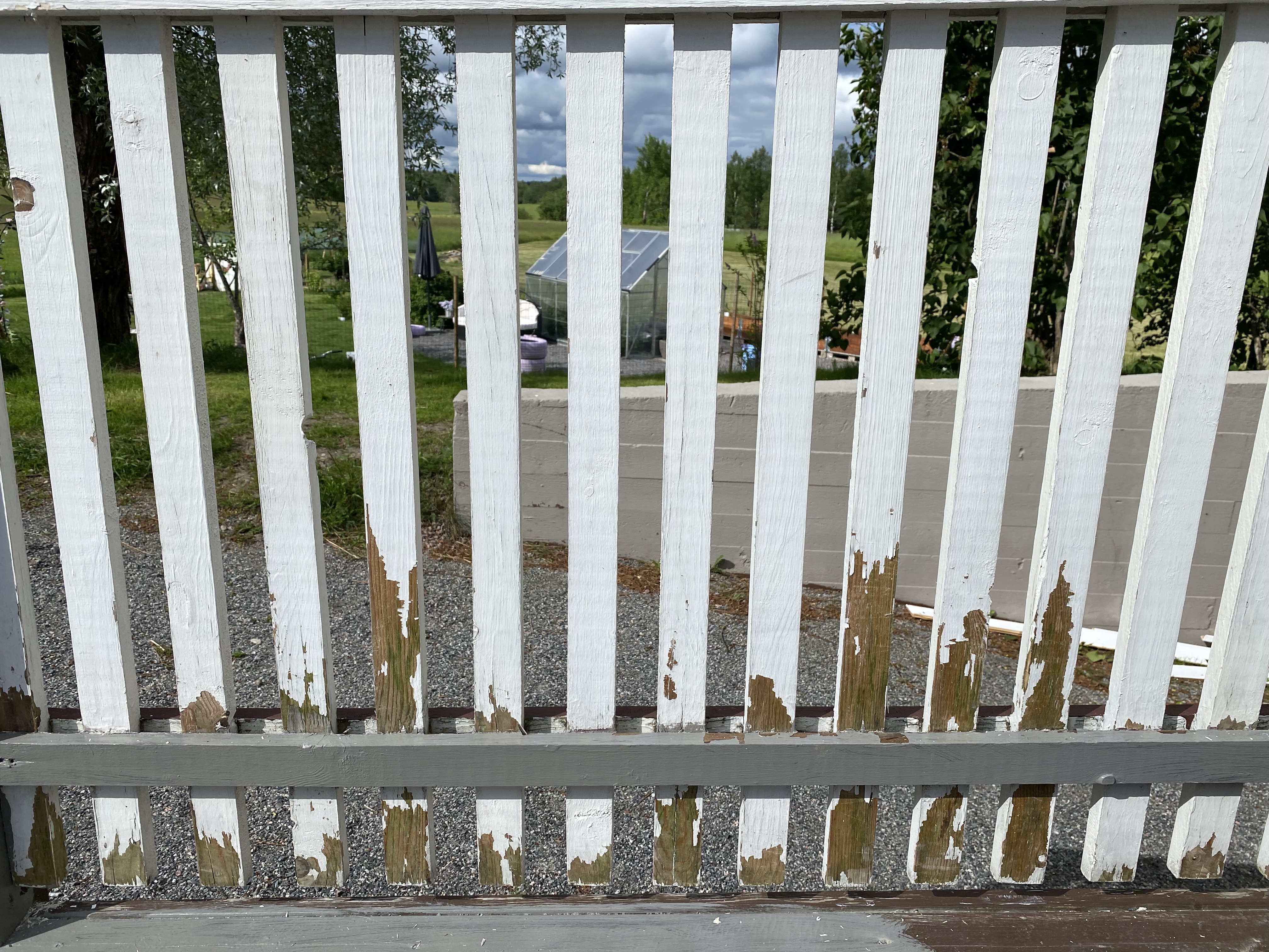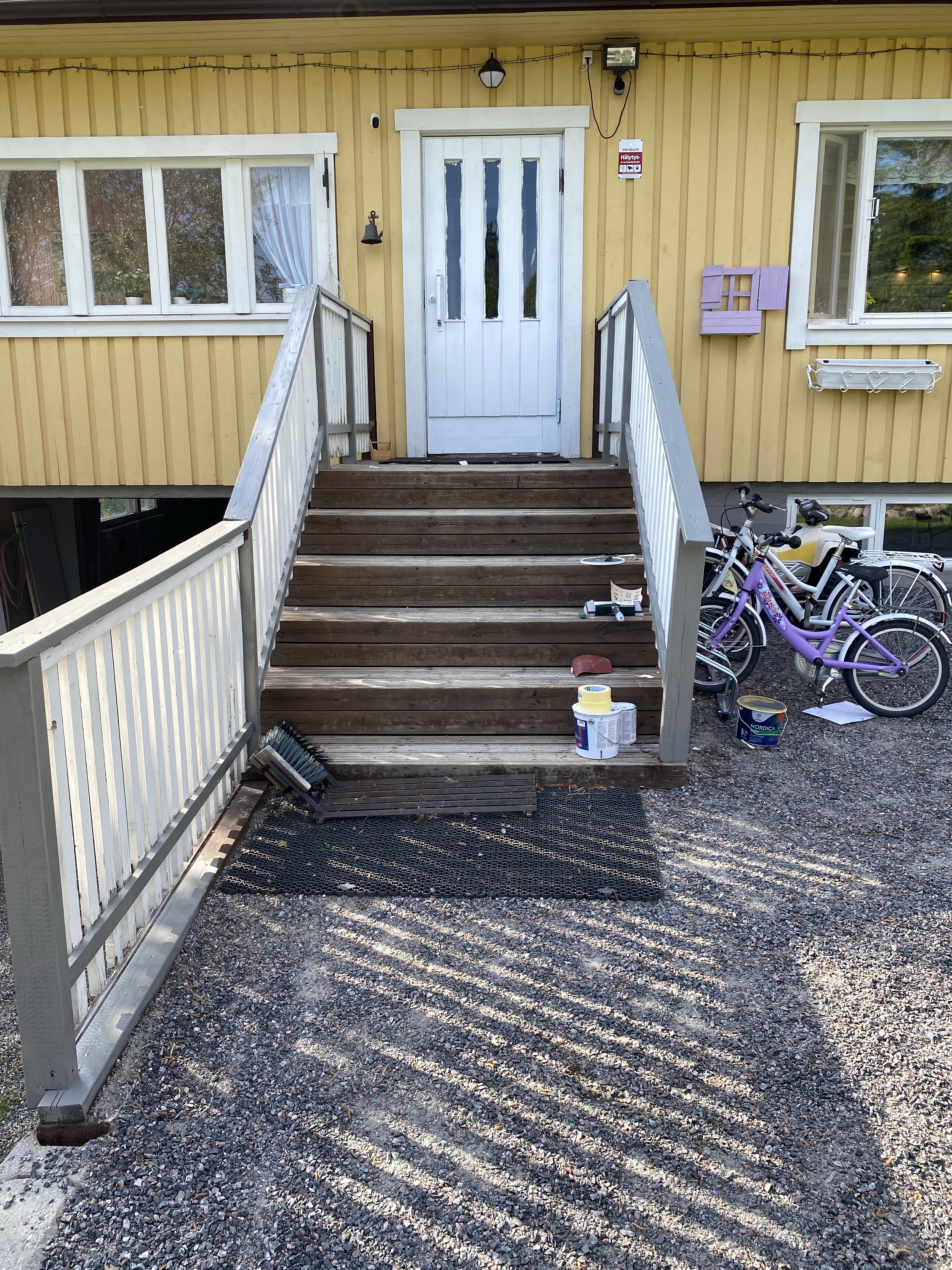Ifall ni trodde det tog slut här så tji fick ni – här ser ni vad jag sysslar med för tillfället. Dörren och det gråa har tidigare varit brunt, har nu dragit två gånger på med grått och sen putsat bort allt gammalt/flagnande från de vita spjälarna. Nu väntar då finslipet, det där målande jag nog faktiskt inte gillar för det testar på mina nerver då man måste få allt vitt där emellan och inte sen klotta ner det gråa (vilket betyder jag måste tejpa in en massa). Får se hur det slutar..