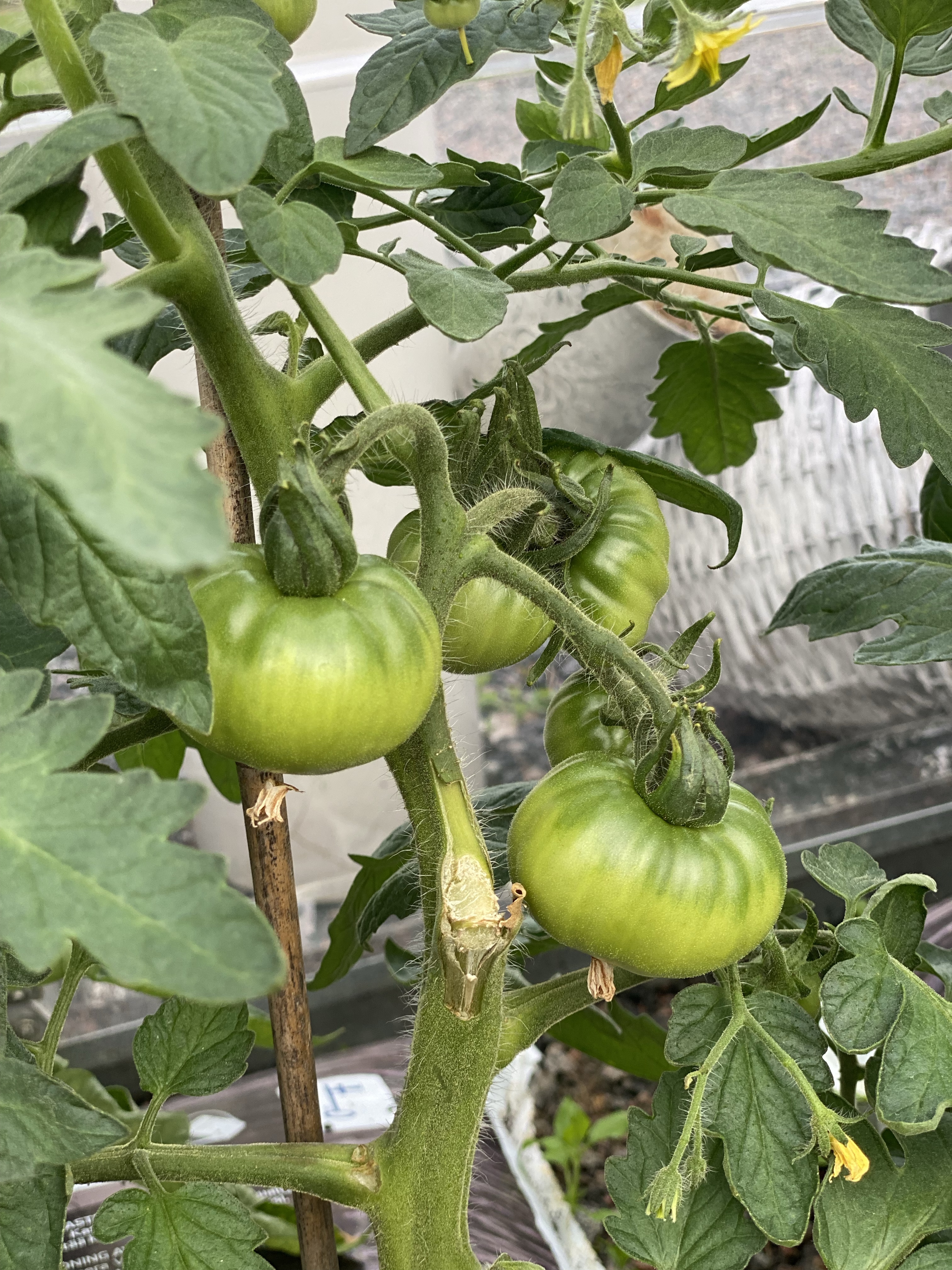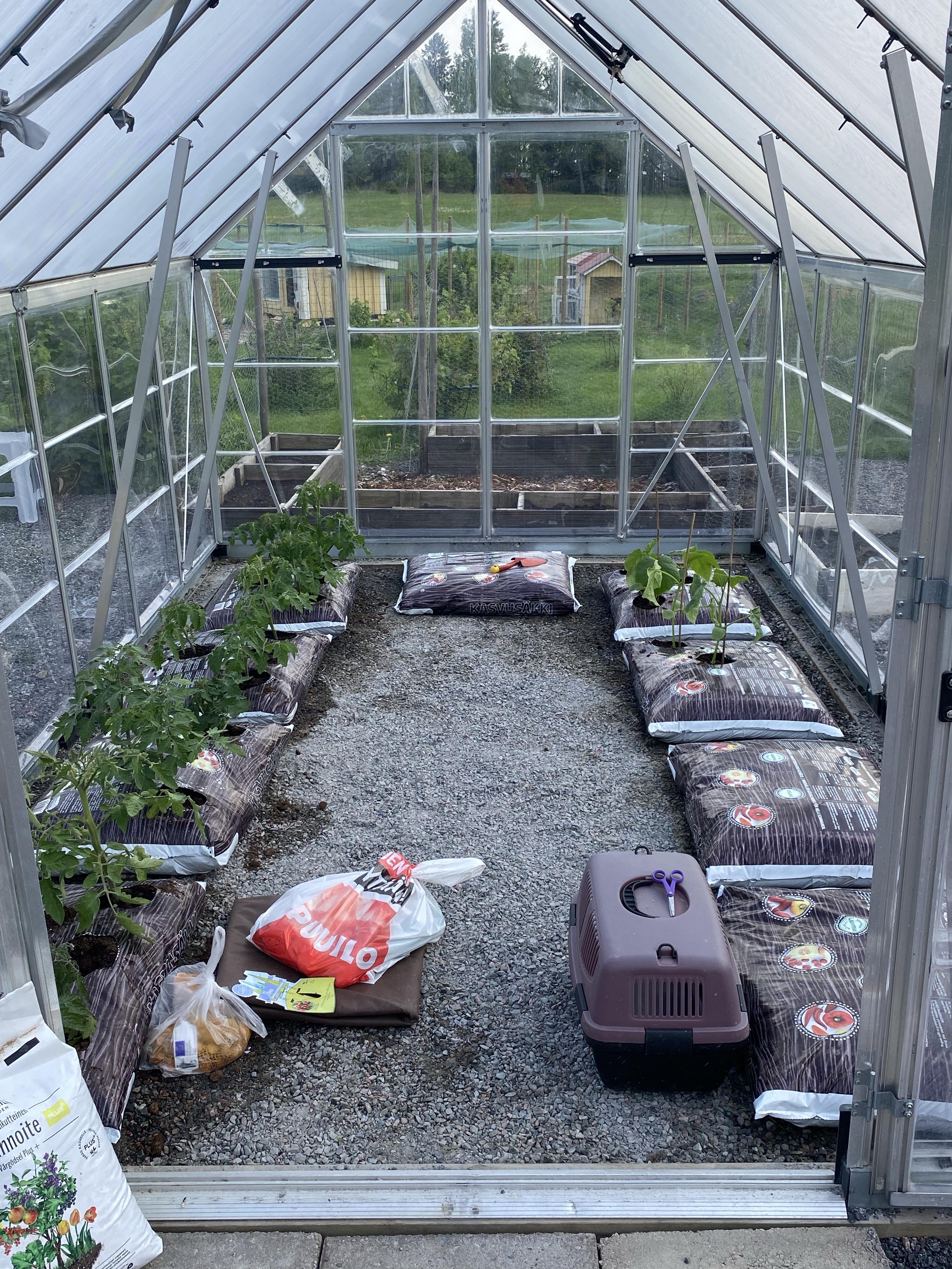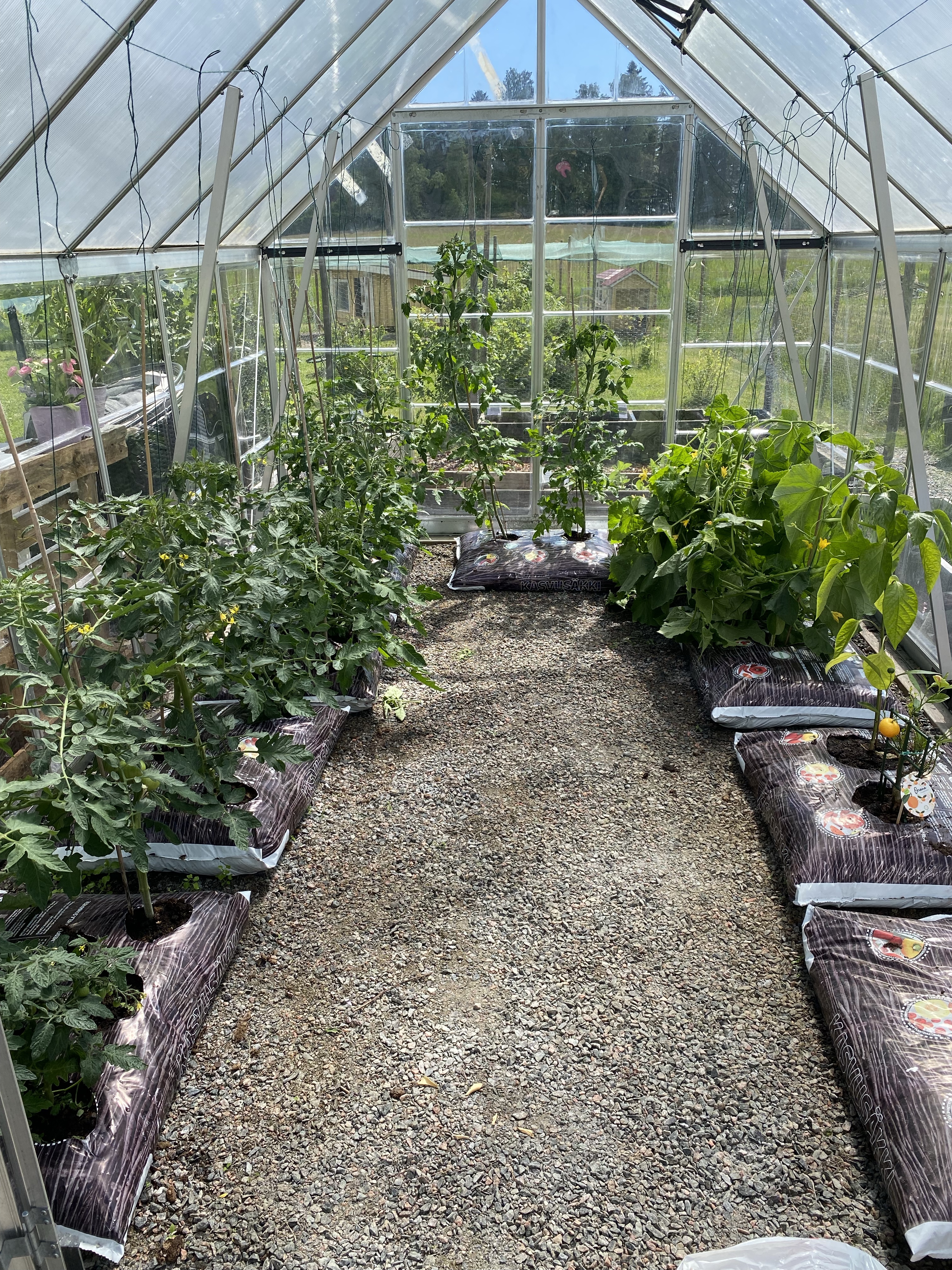 Tomaterna och gurkorna växer så det knakar. Tiden mellan bilderna är 3 veckor och idag har jag knutit fast växterna i växthusets tak för att de inte skall falla. Längst till höger prövar jag i en säck med mandarin och paprika – får se hur de tar sig..