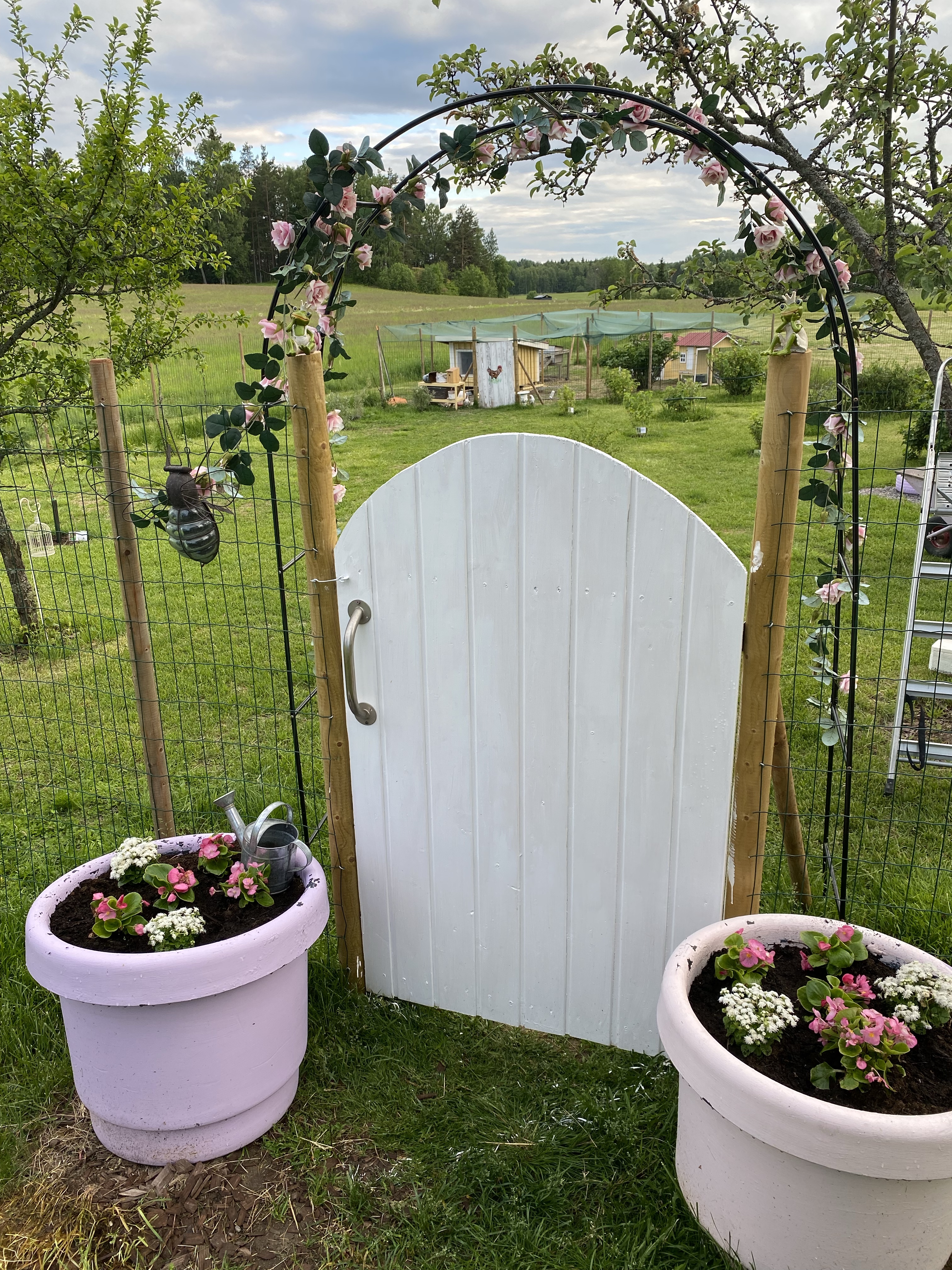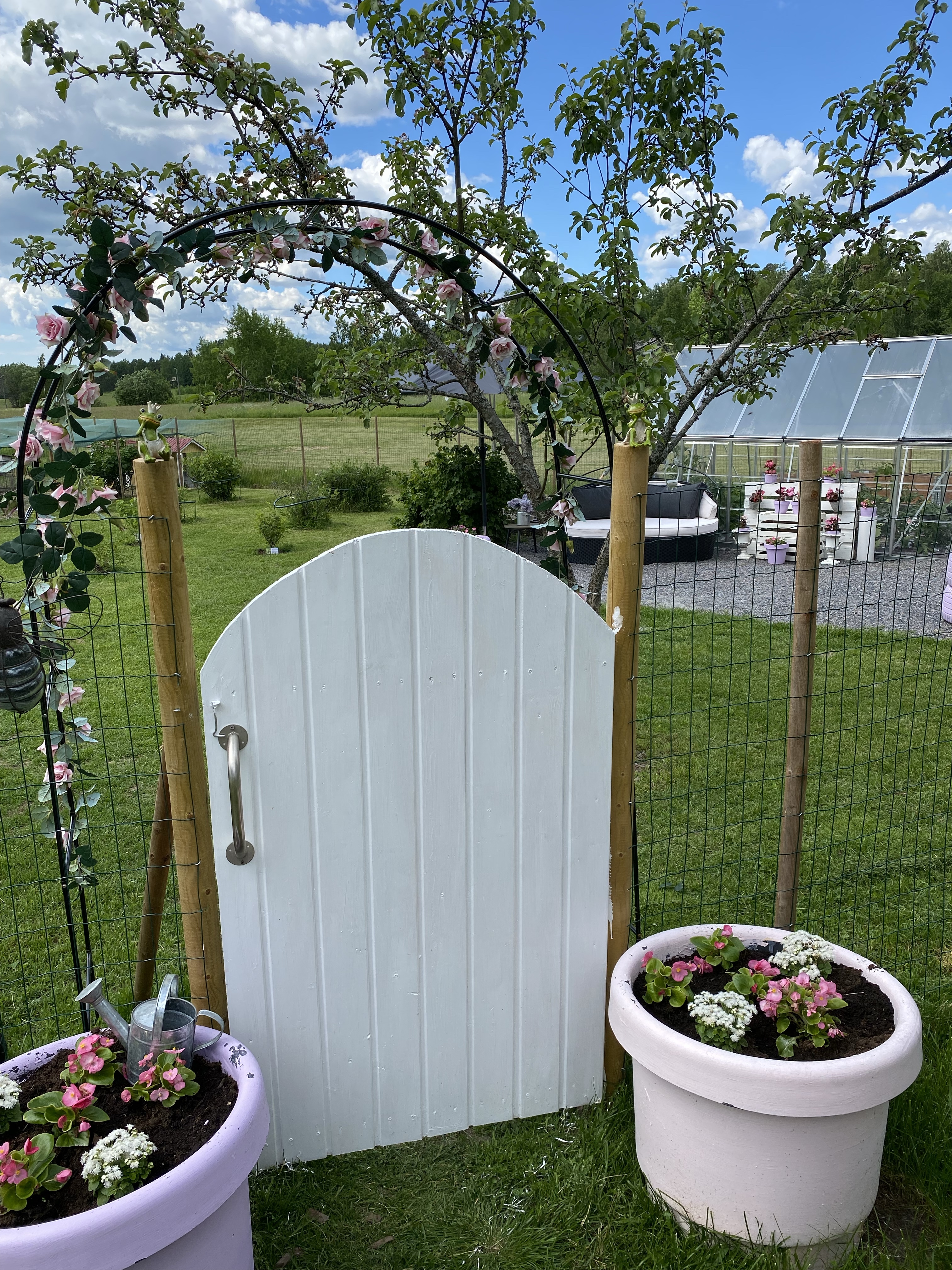 I år har jag (eller rättare sagt min far) satt upp staket så att hararna inte skall äta upp fler äppelträd eller plantor, därför har jag äntligen en egen roseningång till trädgården. Rosorna dock plast men får se om jag något år lyckas få något äkta att växa runt rosenbågen. Givetvis plantor och blomkrukor i mina favoritfärger.