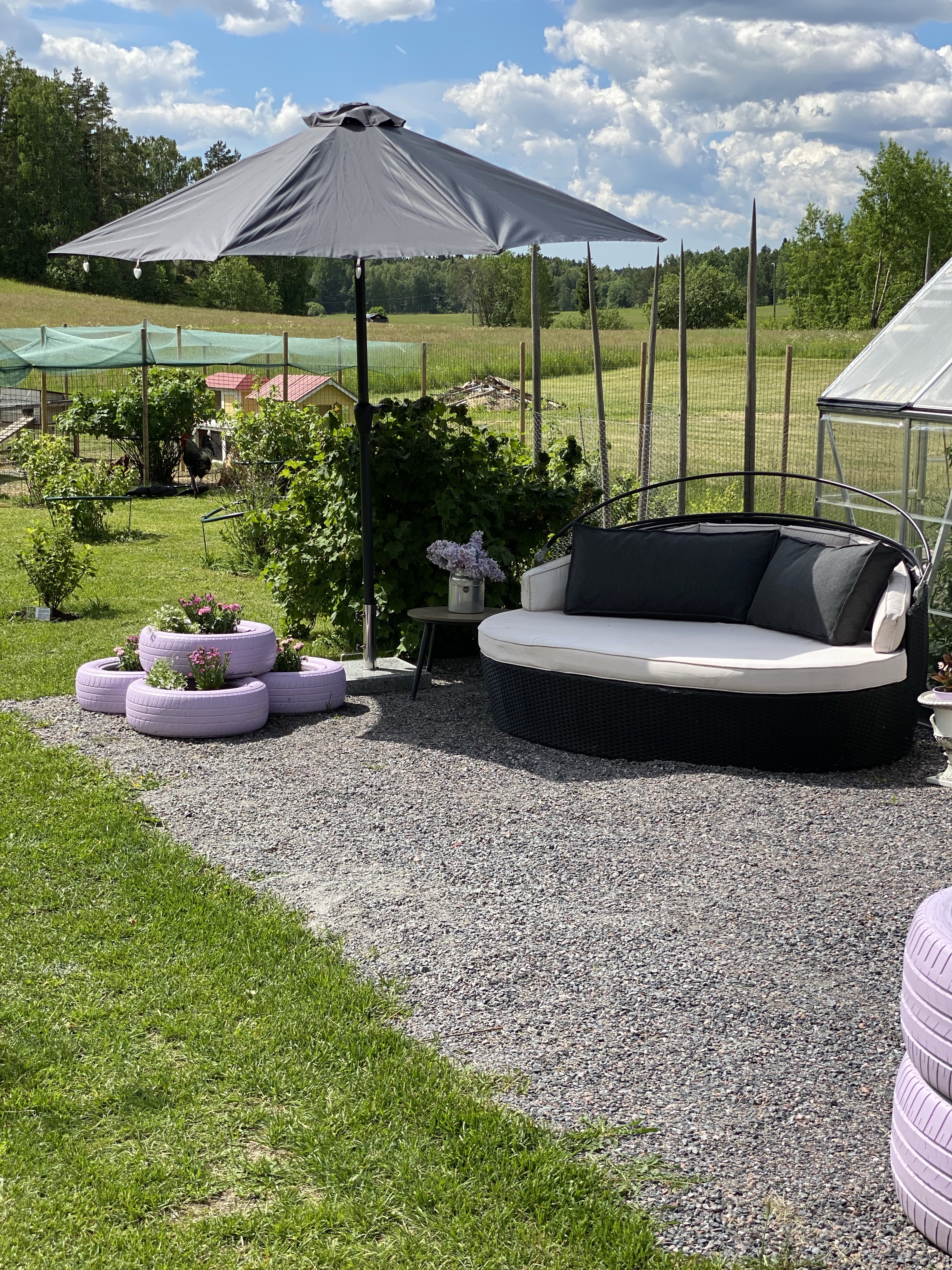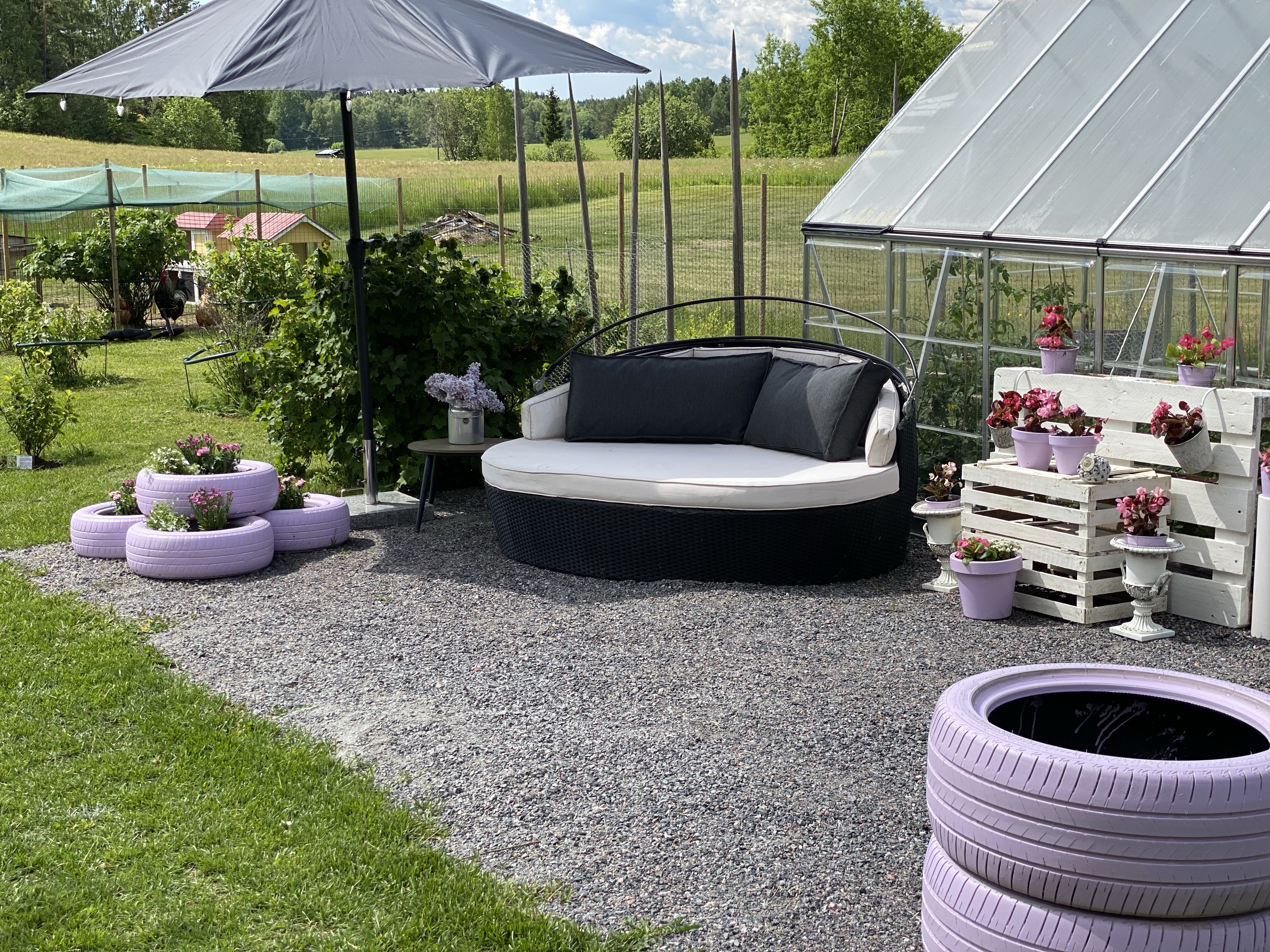 Årets ”trädgårdslounge” blev i år och se ut såhär. Soffan jag hade i fjol fick stanna kvar på bakterrassen och det blev ett litet bo samt blommor istället i trädgården. De två större bilhjulen har ännu utrymme för blommor eller annat kul – får se vad det blir.