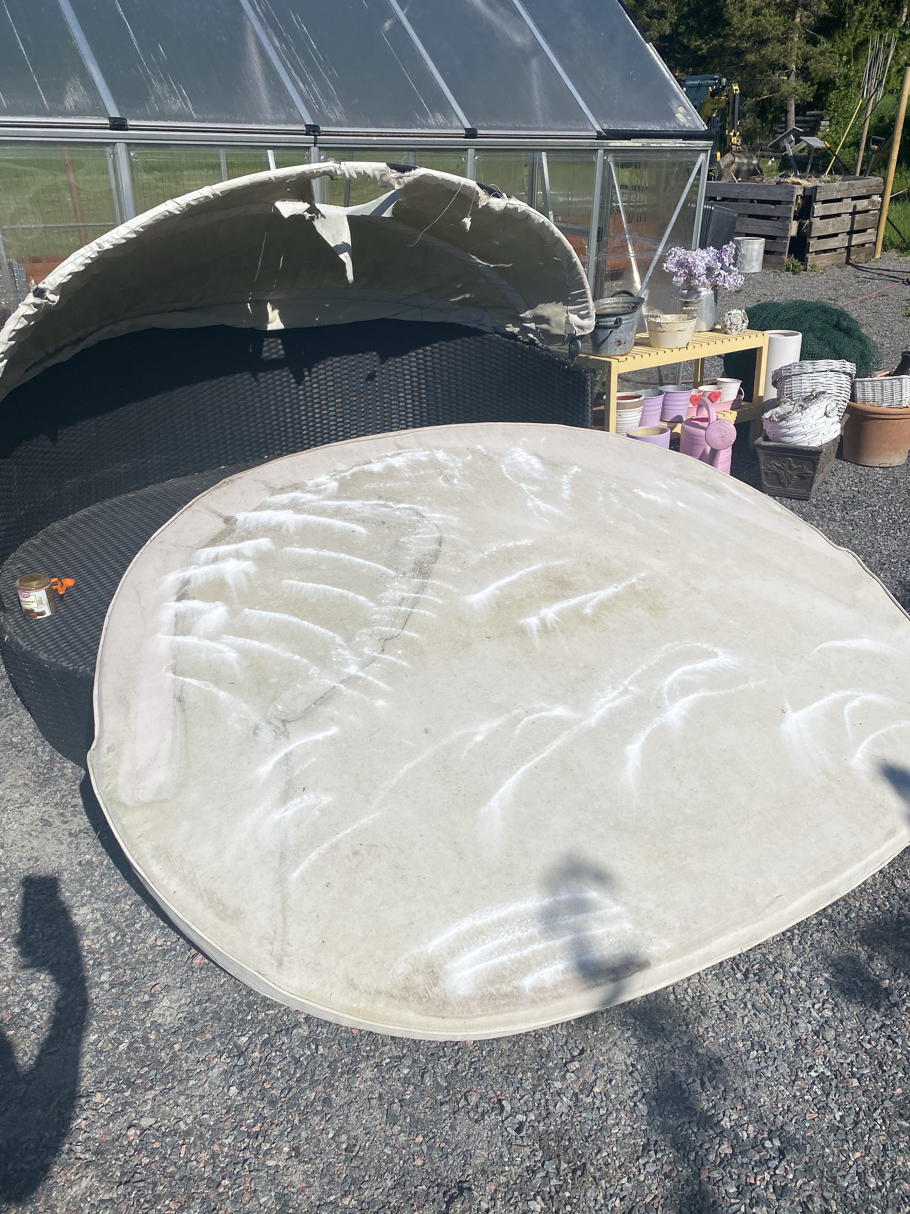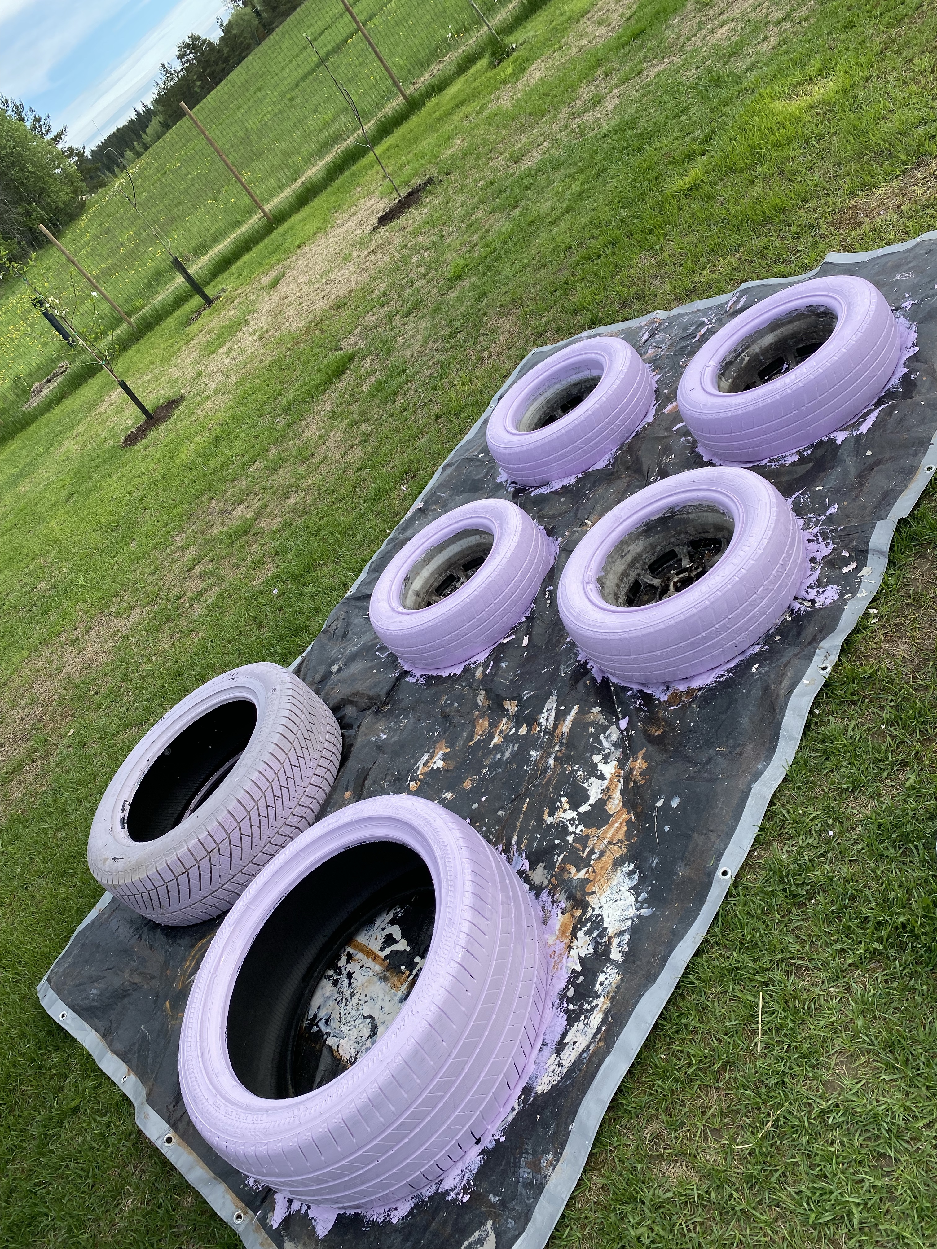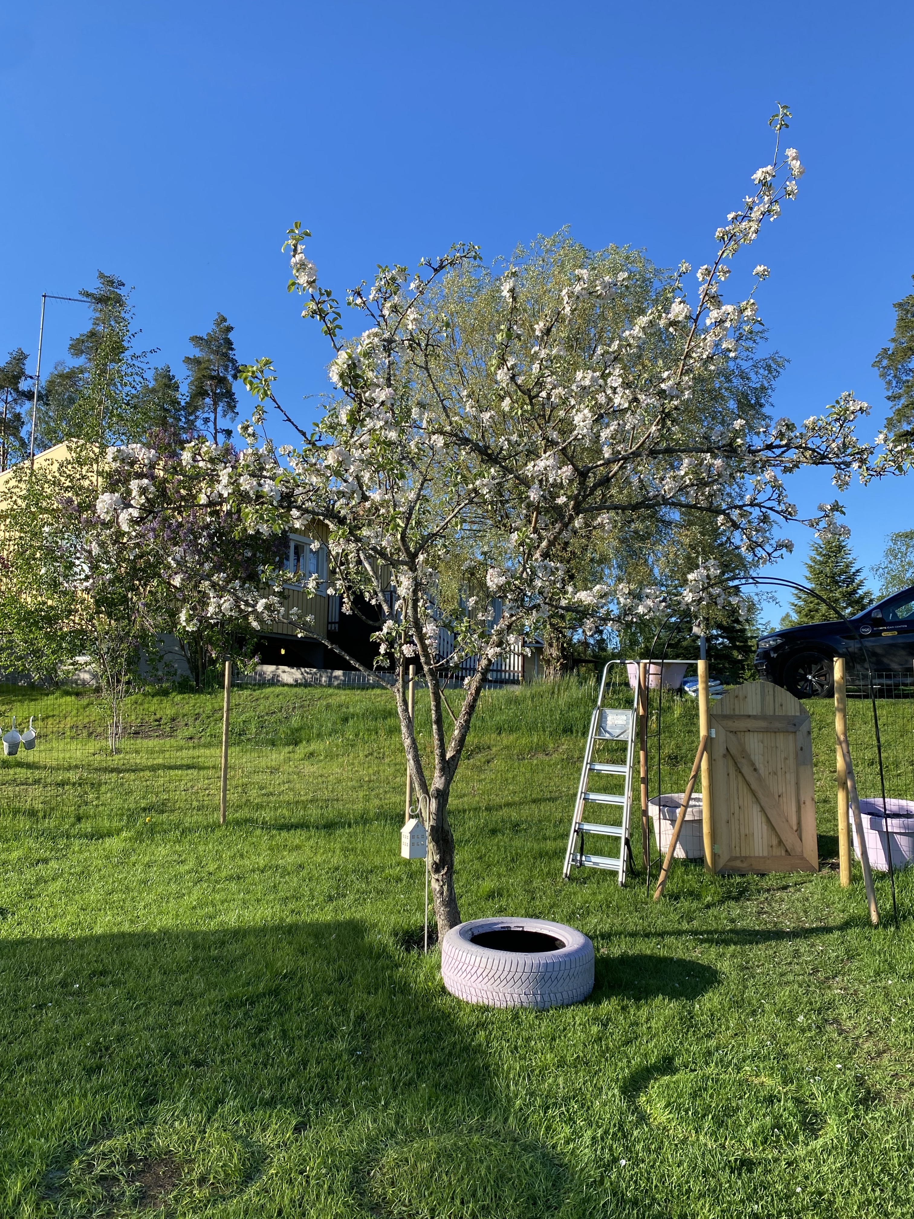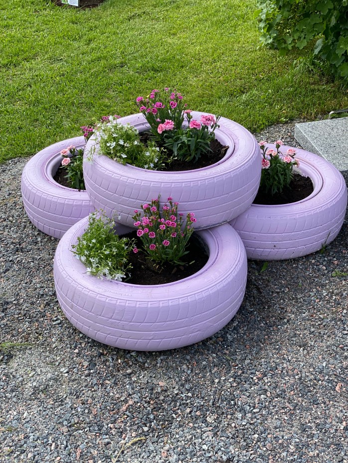 Det första jag tog itu med var mina ”blomkrukor” som behövde putsas – som ni ser är det bilringar som inte mer används som jag hittat bättre användning för. Tyvärr flagnar ju färgen efter en vinter men det är rätt lätt att måla om och inte alls så tidskrävande. De större hjulen söker ännu sin plats – tanken är att de kommer att komma vid roten av äppel- och plommonträden men måste förbereda marken först genom dukar och sand. Men uppe till höger ser ni lite hur jag tänkt. Det skall även komma en gång där förbi från dörren till hönshuset.