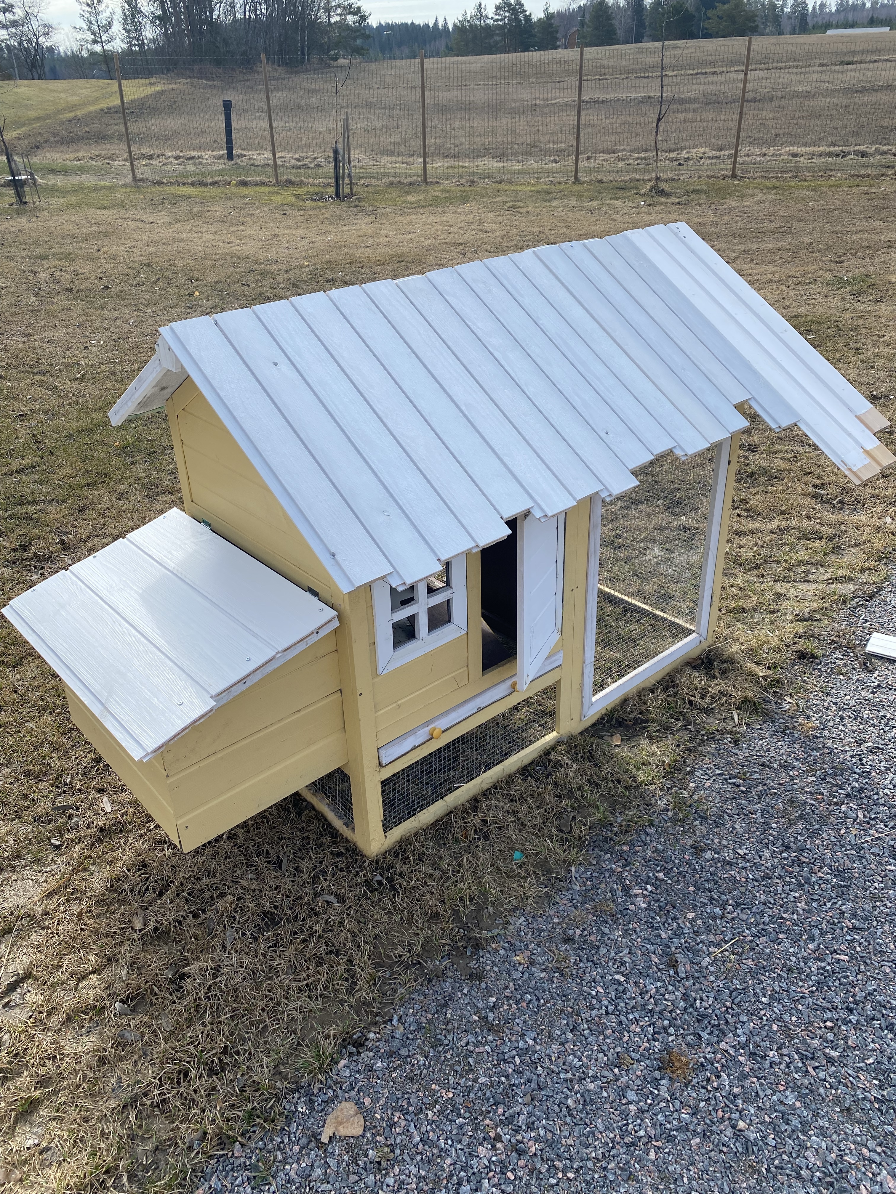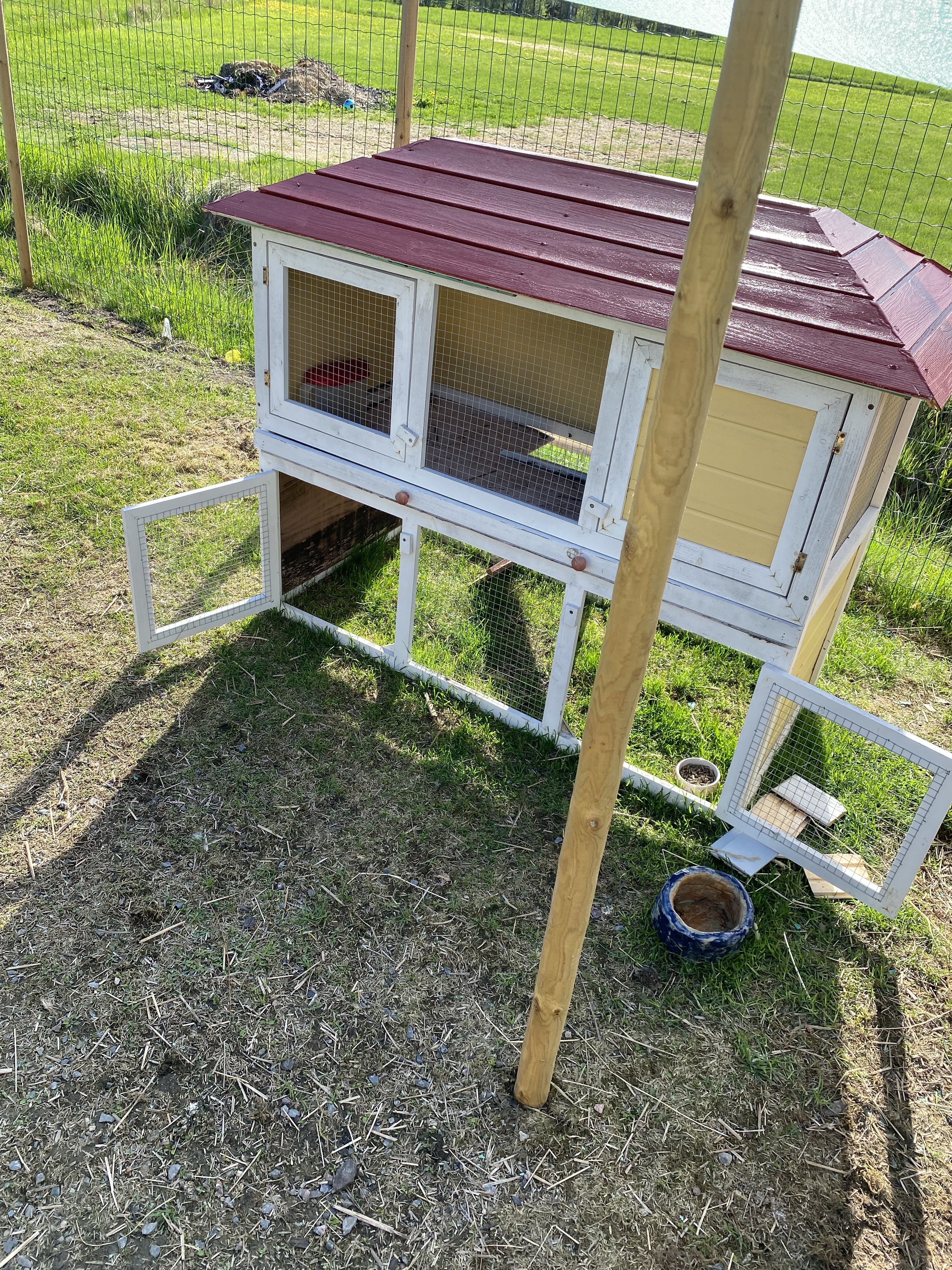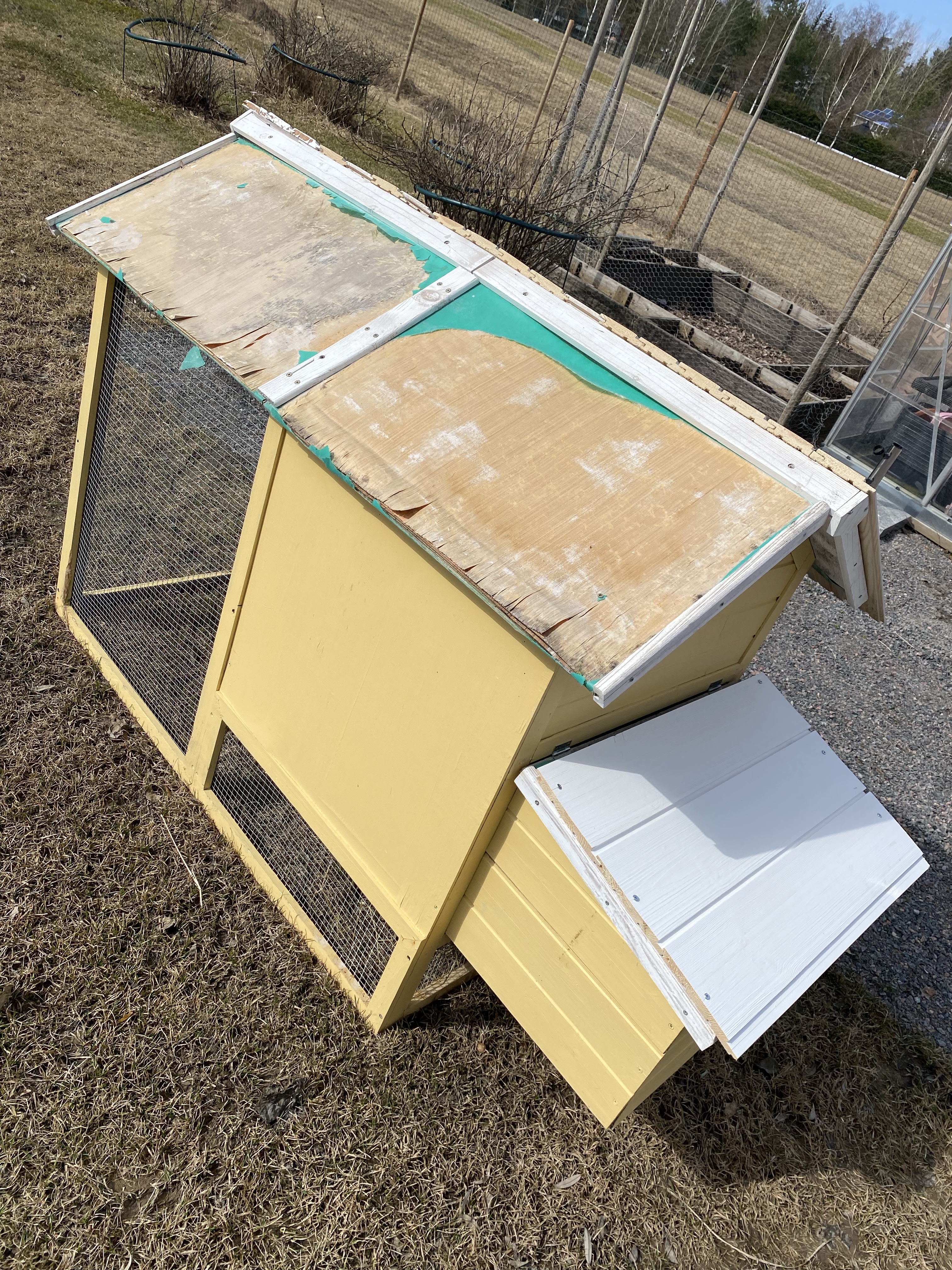Även höns/kaninburarna var i rätt dåligt skick efter förra året (taket var ju något konstigt material som kom med i paketet och det rekommenderas hållas under tak/i skydd för regn). Jag hade ju dem och stå ute i regn och rusk och resultatet blev ju även därefter. Här ovan ser ni först mina egna försök till restaurering – var så ivrig så jag bara slog på plankorna och tänkte man sedan tar med el-sågen men sen fick nog pappa komma och hjälpa med cirkelsågen. Hans resultat ser ni nedan, betydligt bättre resultat men kanske jag också lär mig någon vacker dag..Det fick även bli rött tak – i samma linje som större hönshuset och vårt egna hus.