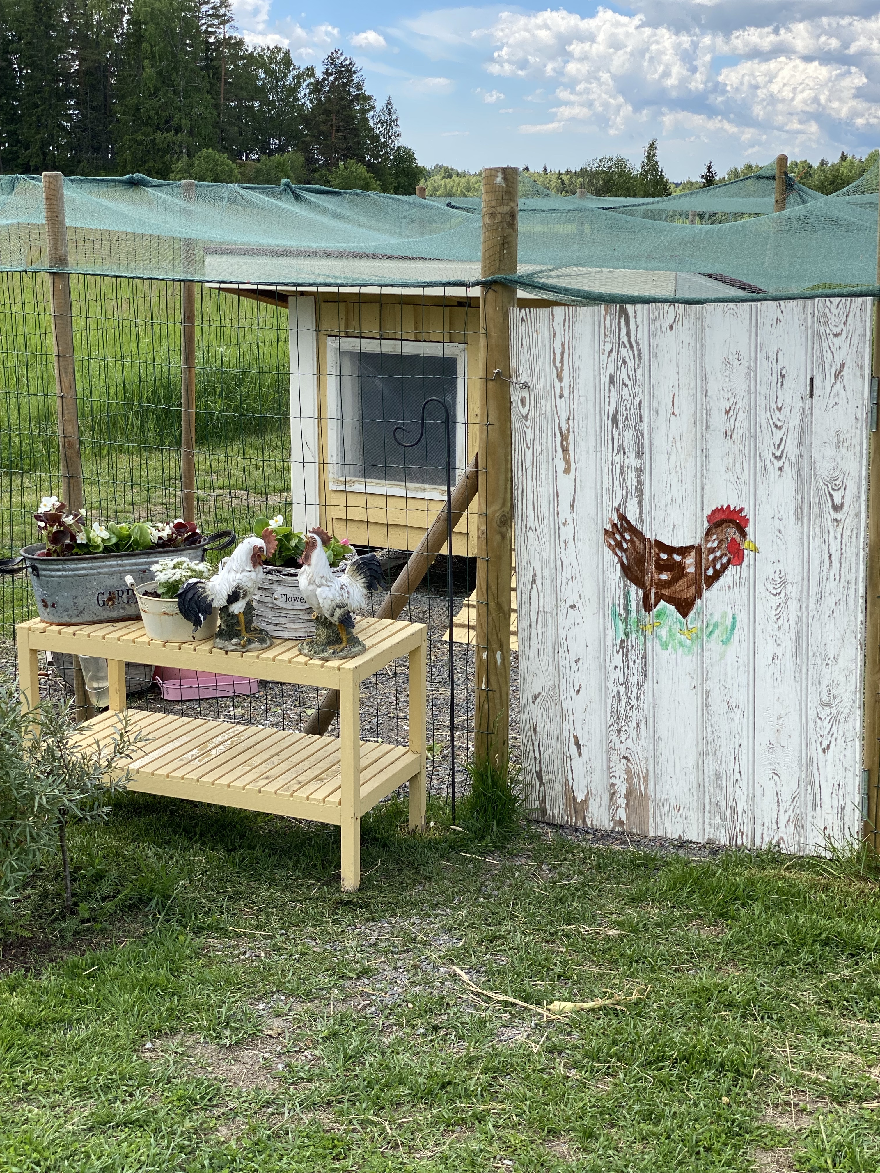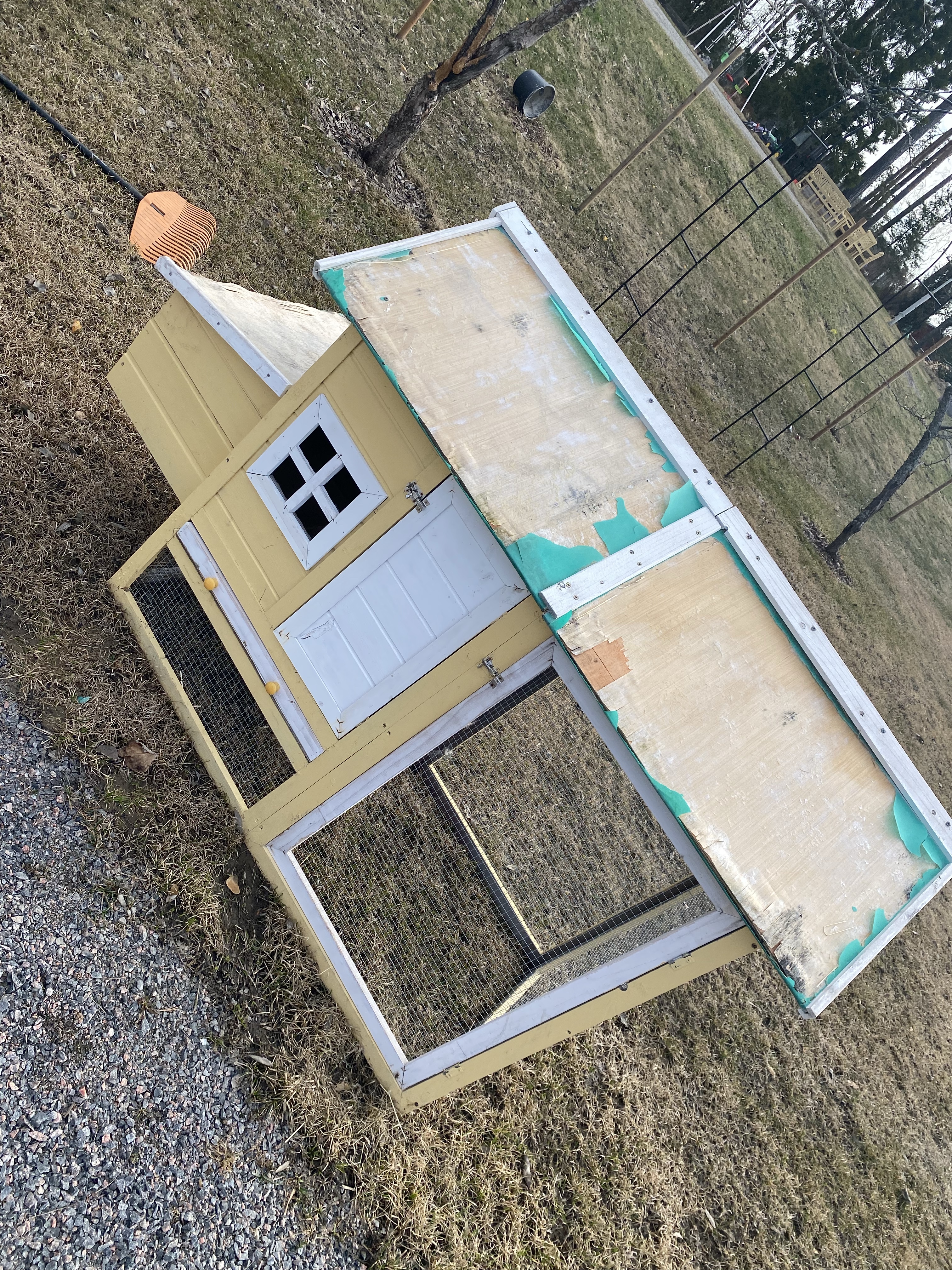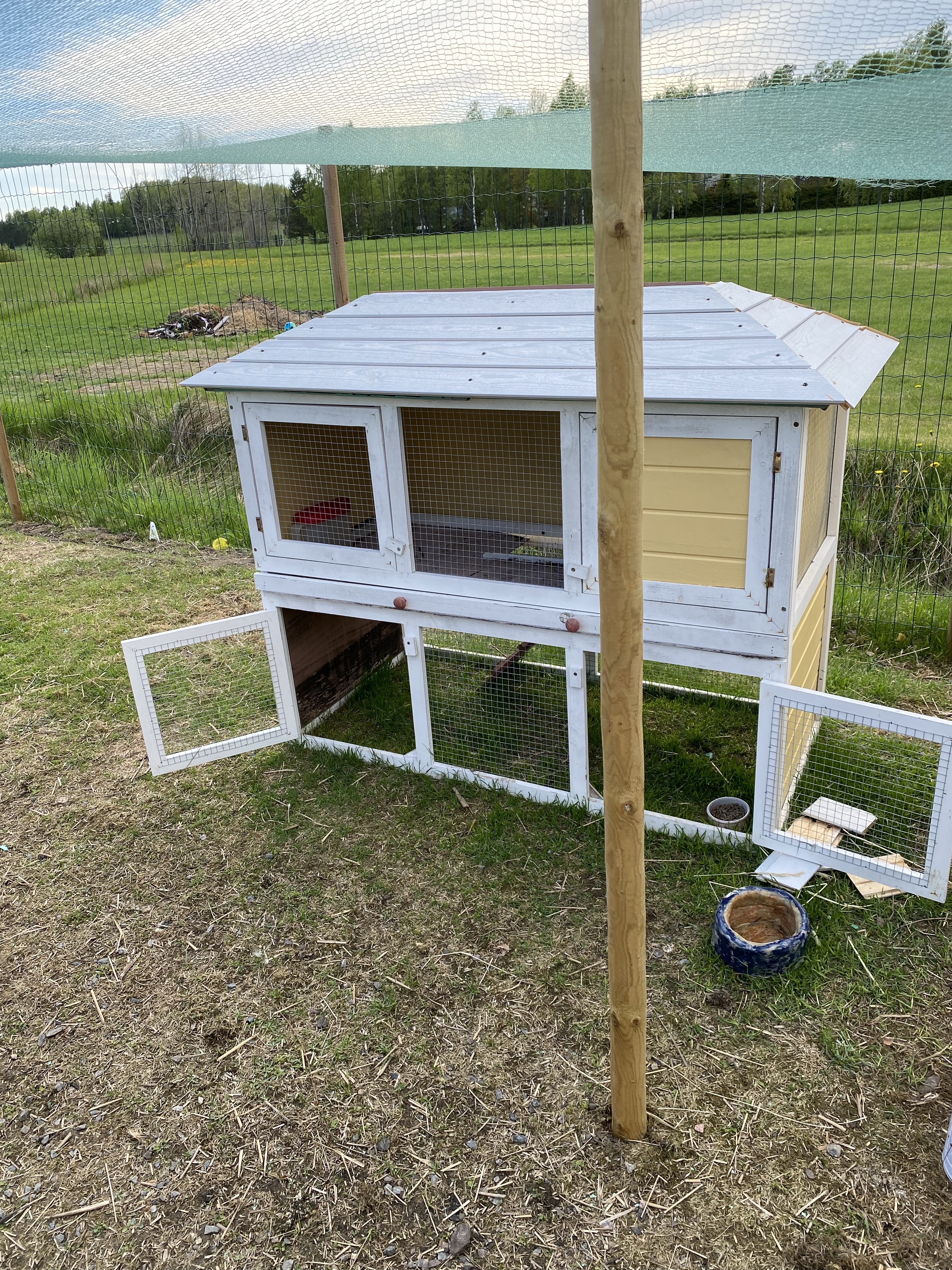 Även höns/kaninburarna var i rätt dåligt skick efter förra året (taket var ju något konstigt material som kom med i paketet och det rekommenderas hållas under tak/i skydd för regn). Jag hade ju dem och stå ute i regn och rusk och resultatet blev ju även därefter. Här ovan ser ni först mina egna försök till restaurering – var så ivrig så jag bara slog på plankorna och tänkte man sedan tar med el-sågen men sen fick nog pappa komma och hjälpa med cirkelsågen. Hans resultat ser ni nedan, betydligt bättre resultat men kanske jag också lär mig någon vacker dag..Det fick även bli rött tak – i samma linje som större hönshuset och vårt egna hus.