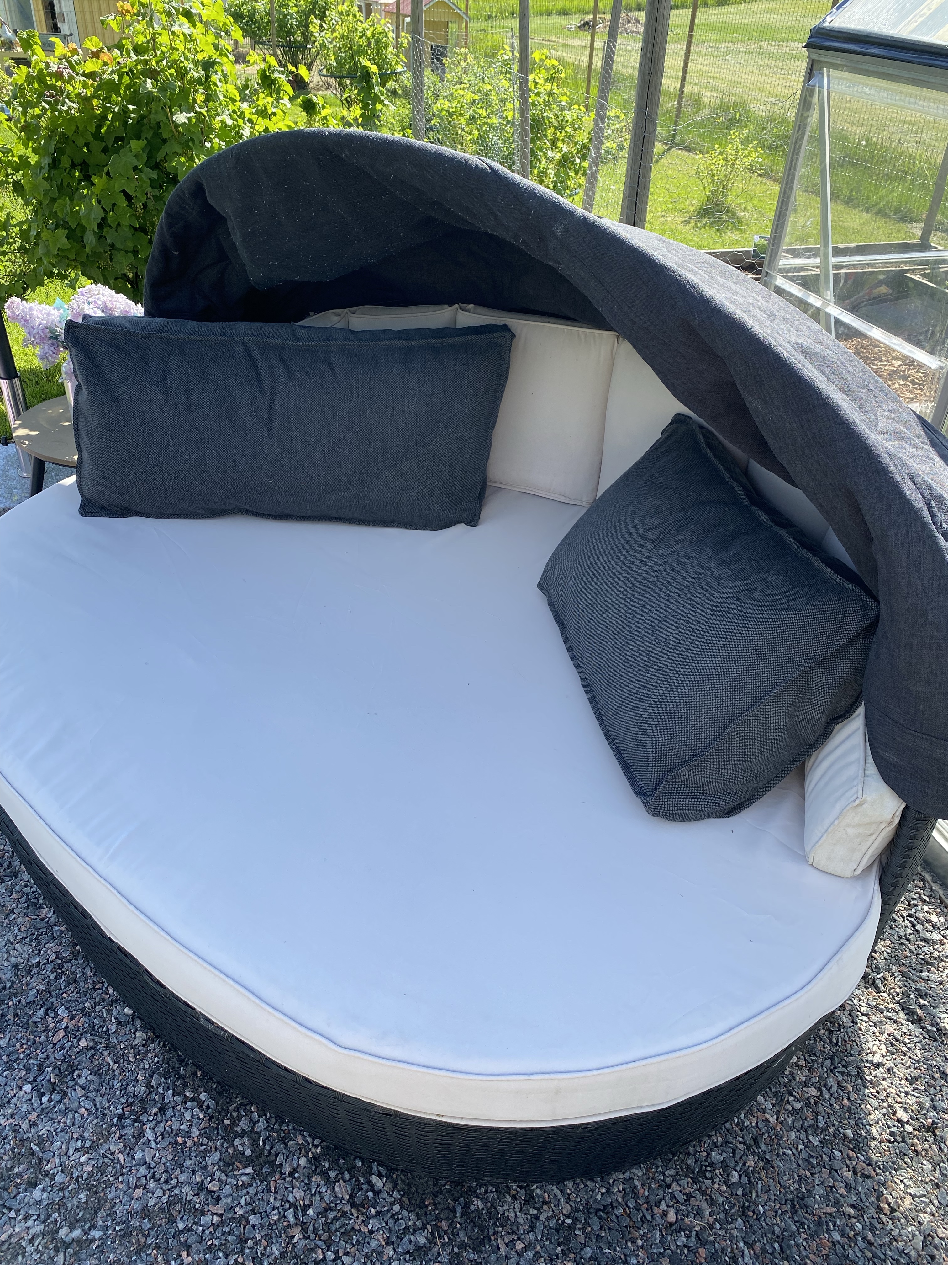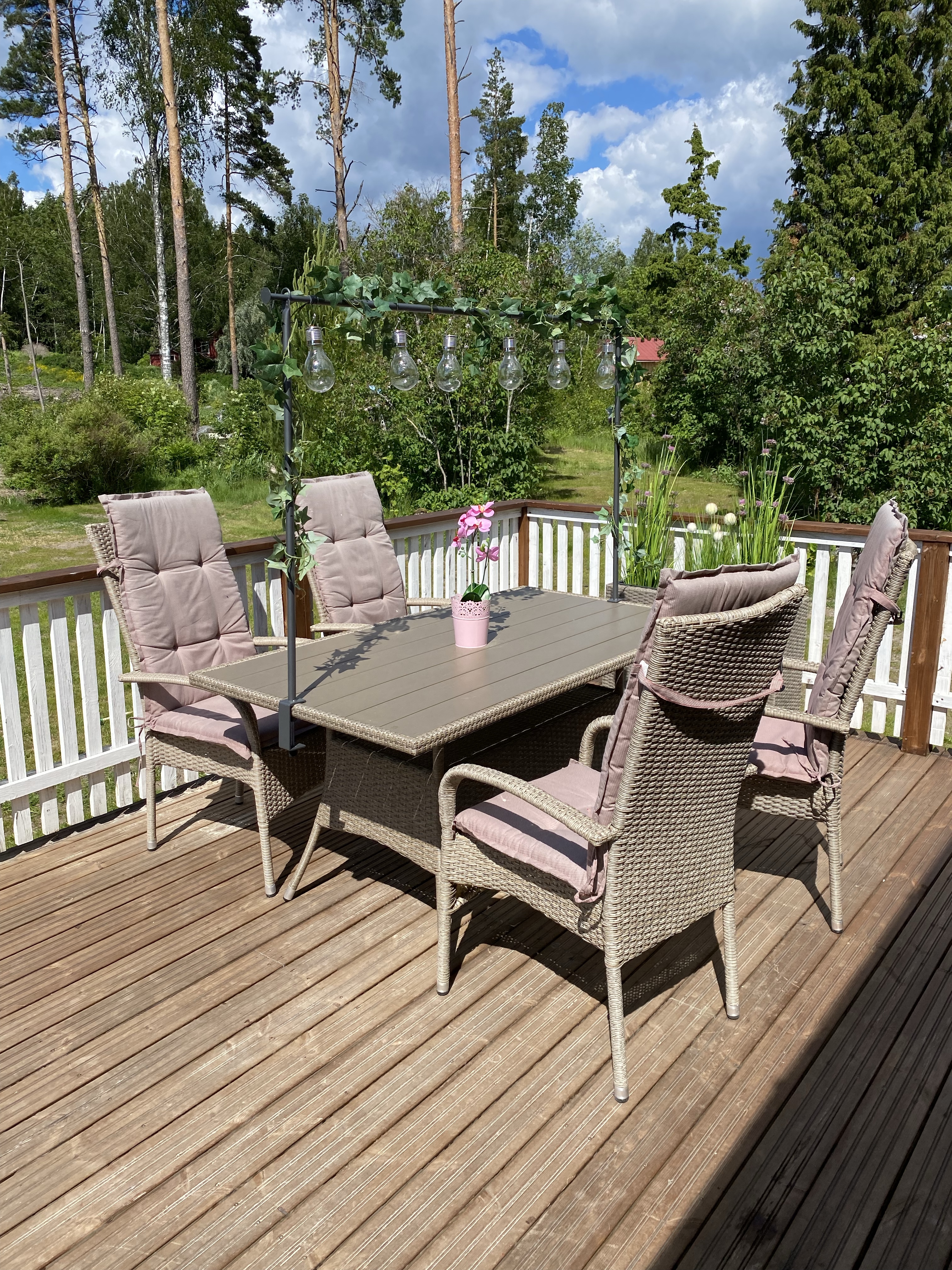 Bakterrassen har fått liten terrassmatta och attiraljer från Rusta – soffan och stolarna hade jag ifjol i trädgårdsloungen men i år får de hållas här – hit når kvällssolen och här brukar jag sitta sena sommarkvällar då värmen är på topp 🙂