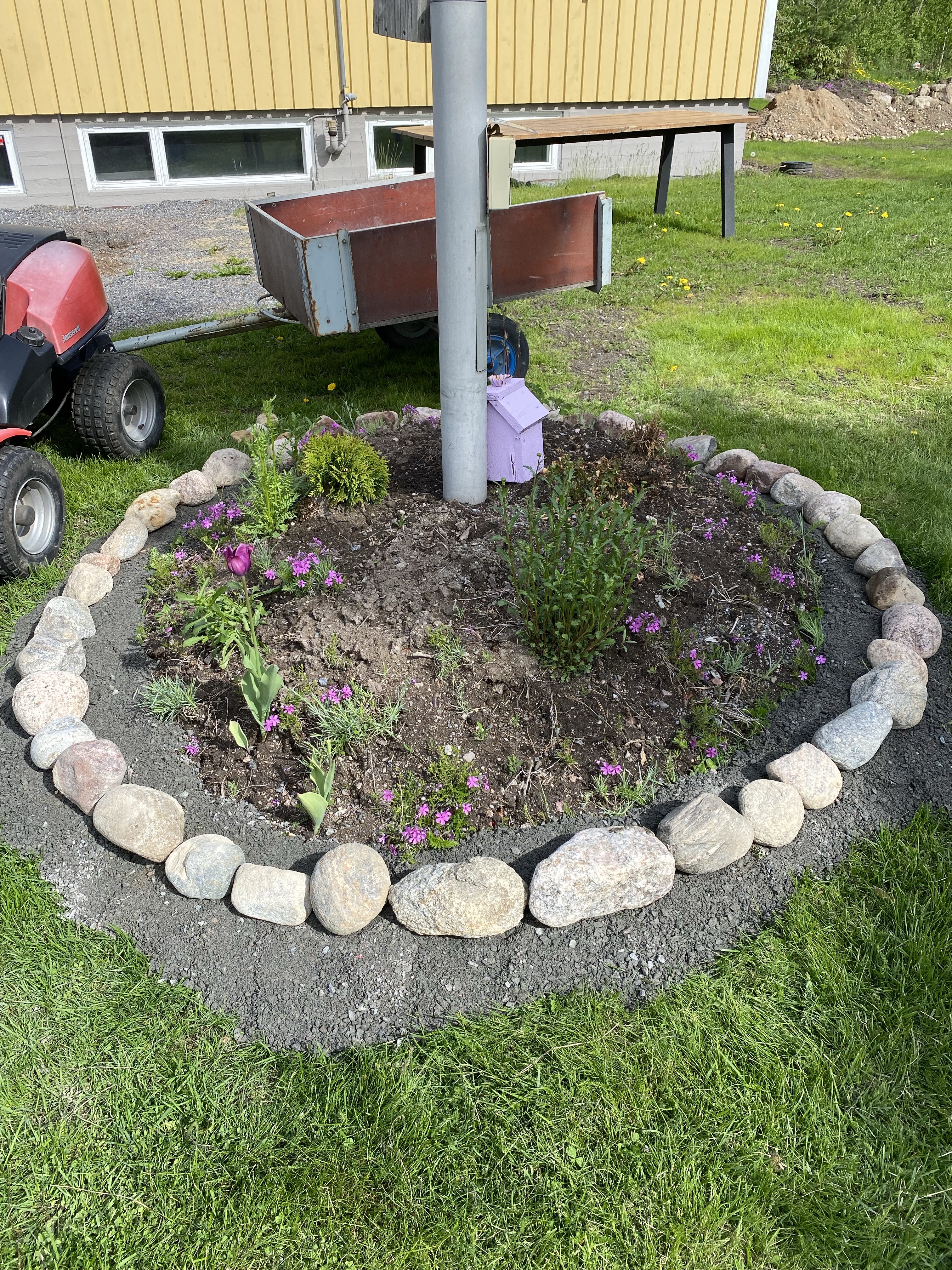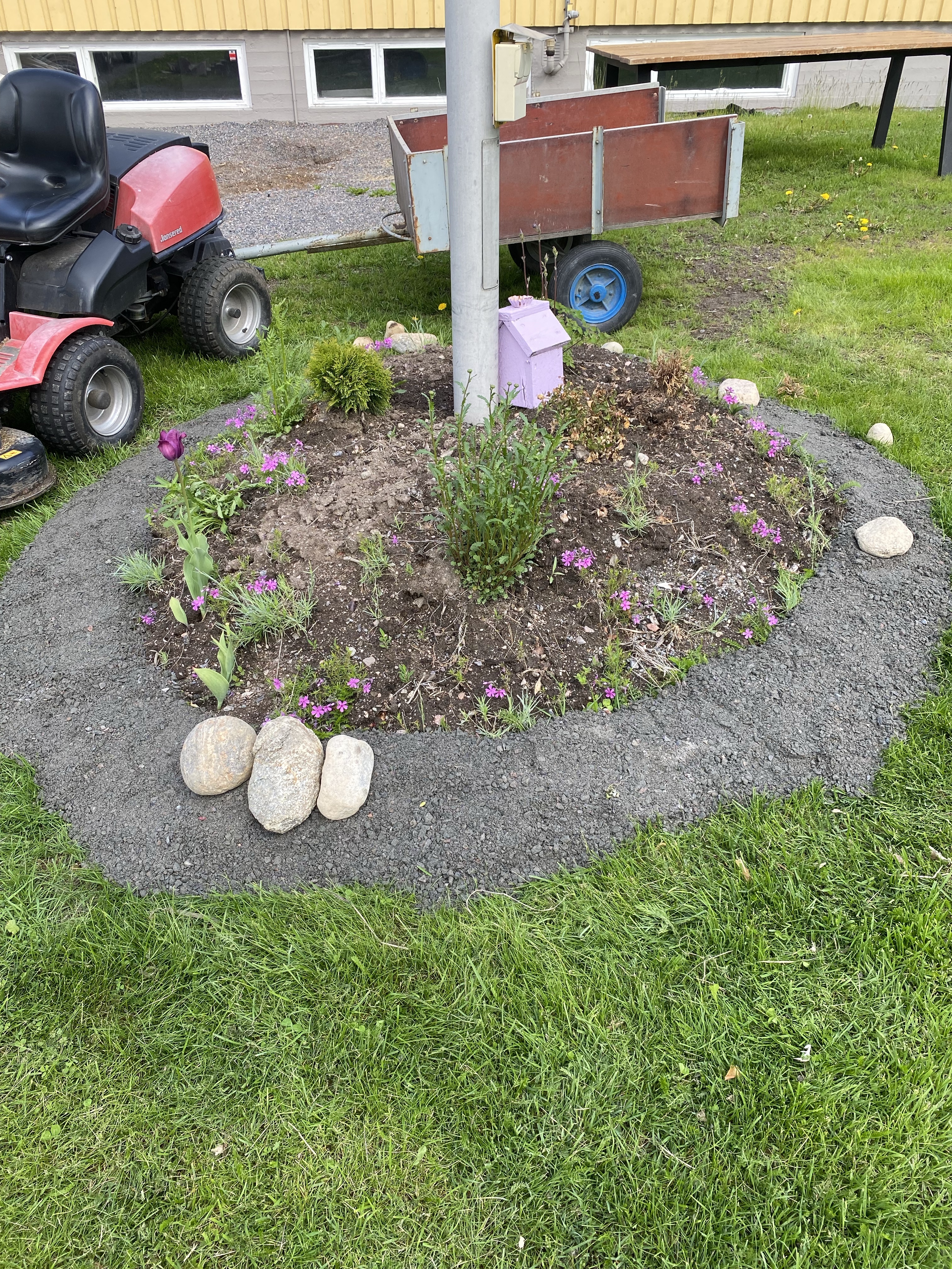 Det är konstigt hur stor skillnad det är då man ”markerar” och fixar kanter i en rabatt – innan såg det ut som jag bara lassat av mylla i en hög men med lite stenar så blev det vips som en riktig blomrabatt. Det här var en riktig styrketräning eftersom jag var tvungen att gå upp och ner för en backe efter alla stenar.