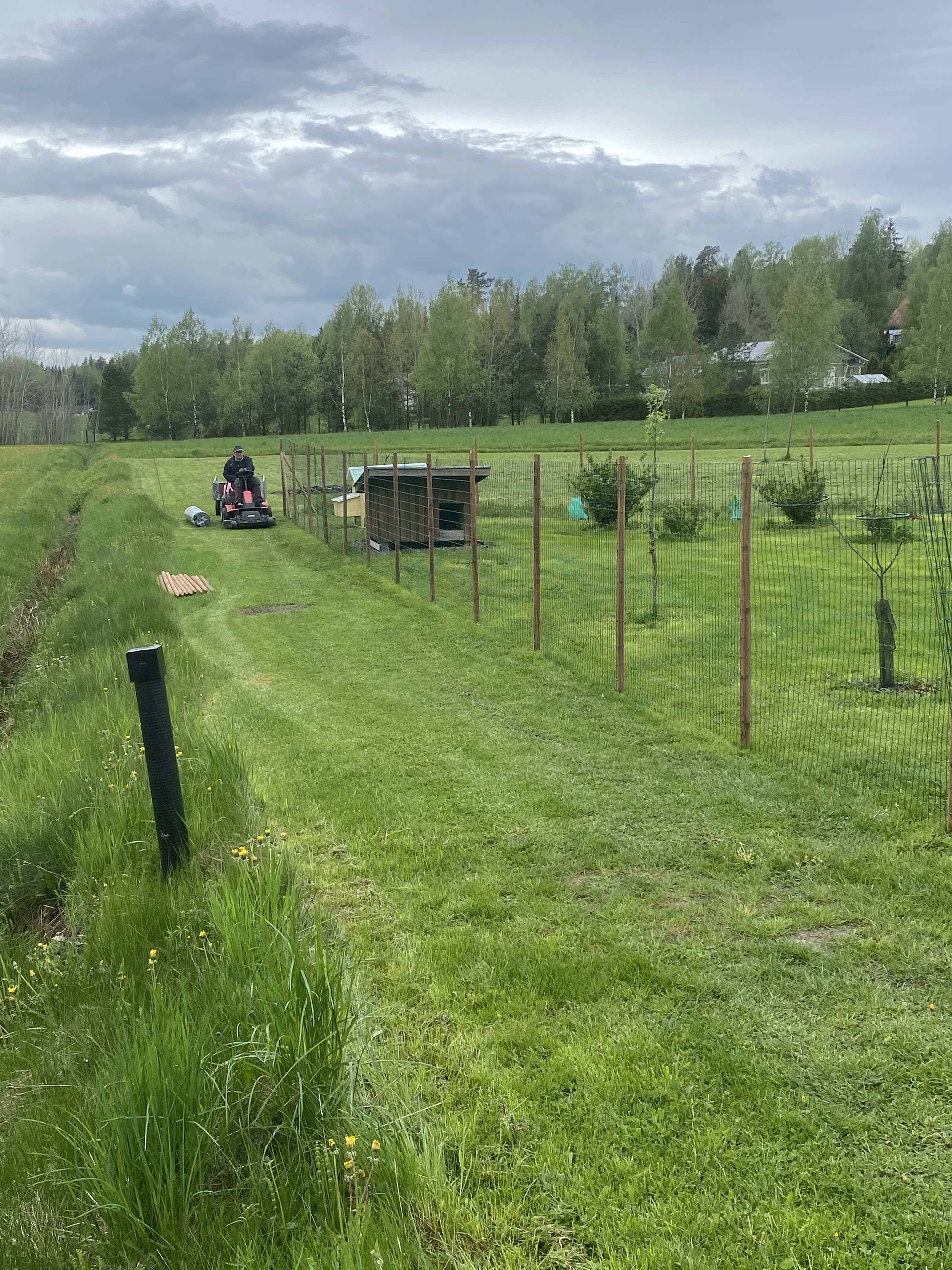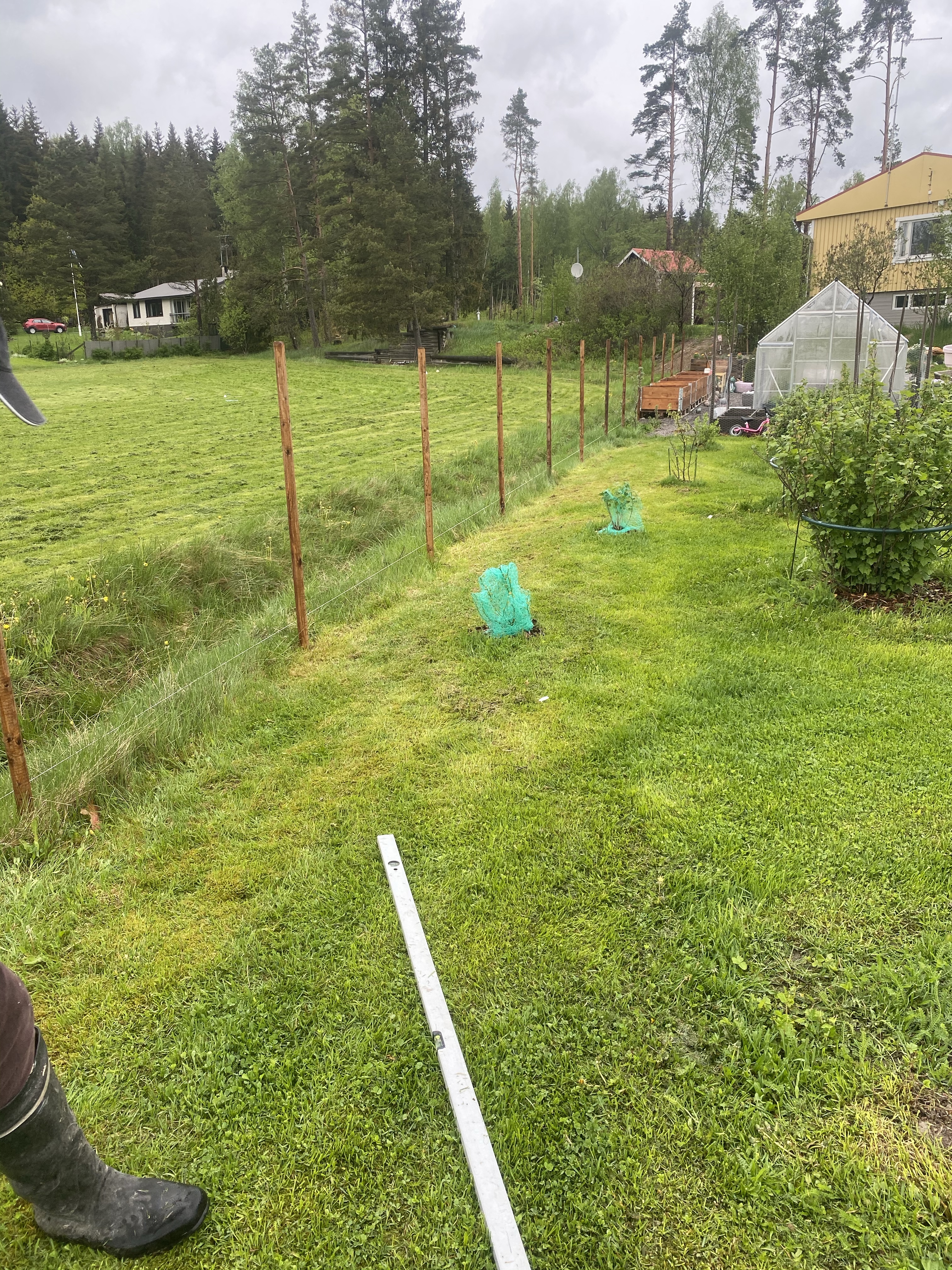 Det kommer att komma 1,5 m nät kring denna trädgård till hösten (hela vägen runt) men tills dess är nu pålar satta så trädet växer rakt (vilket jag struntat i tidigare) och näten ordentligt fixade.