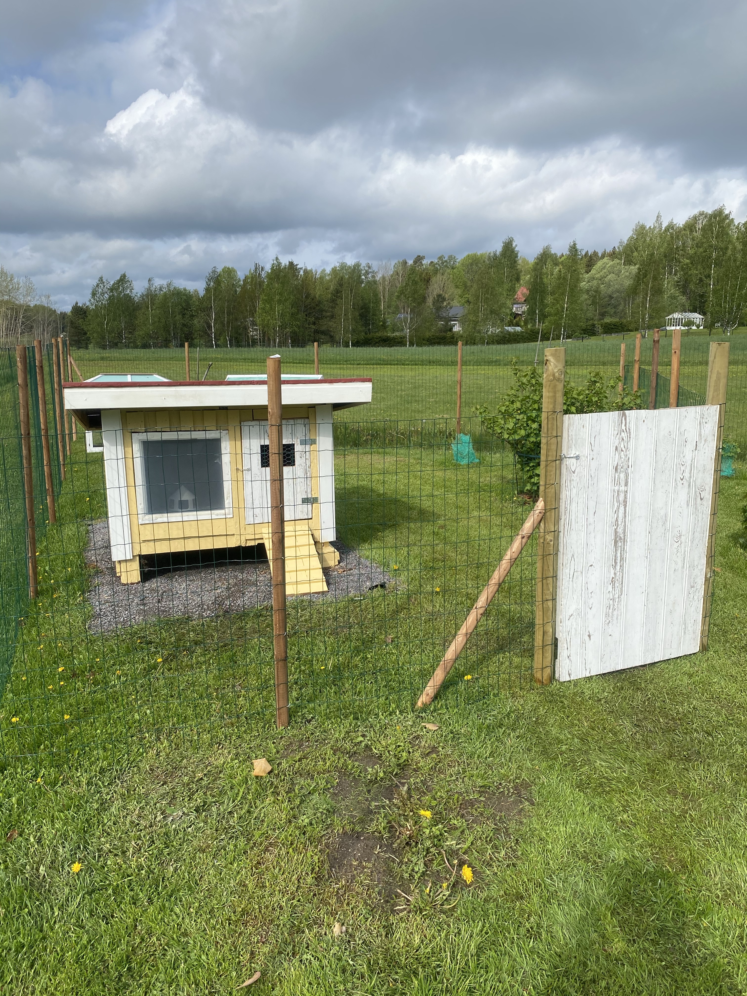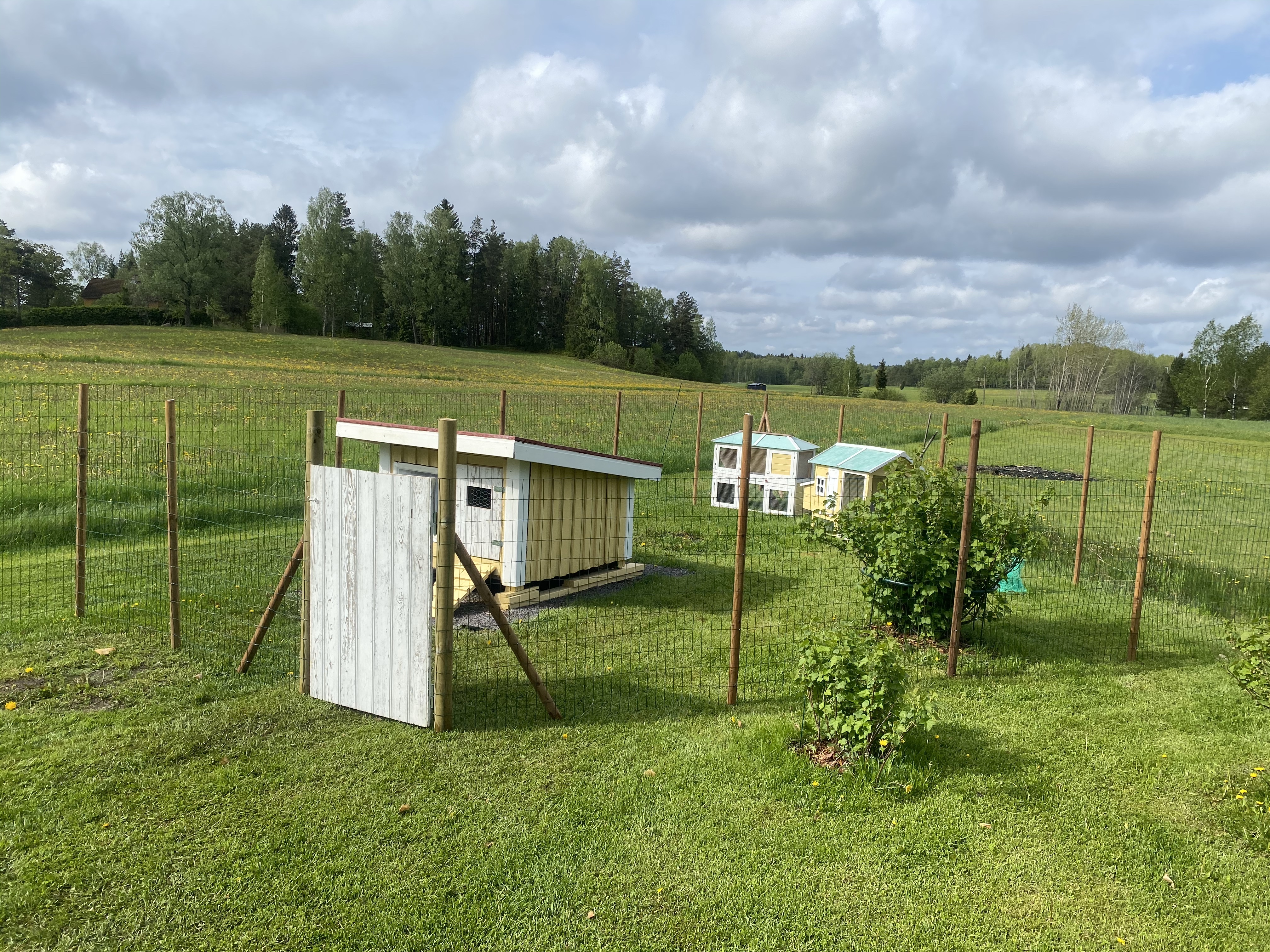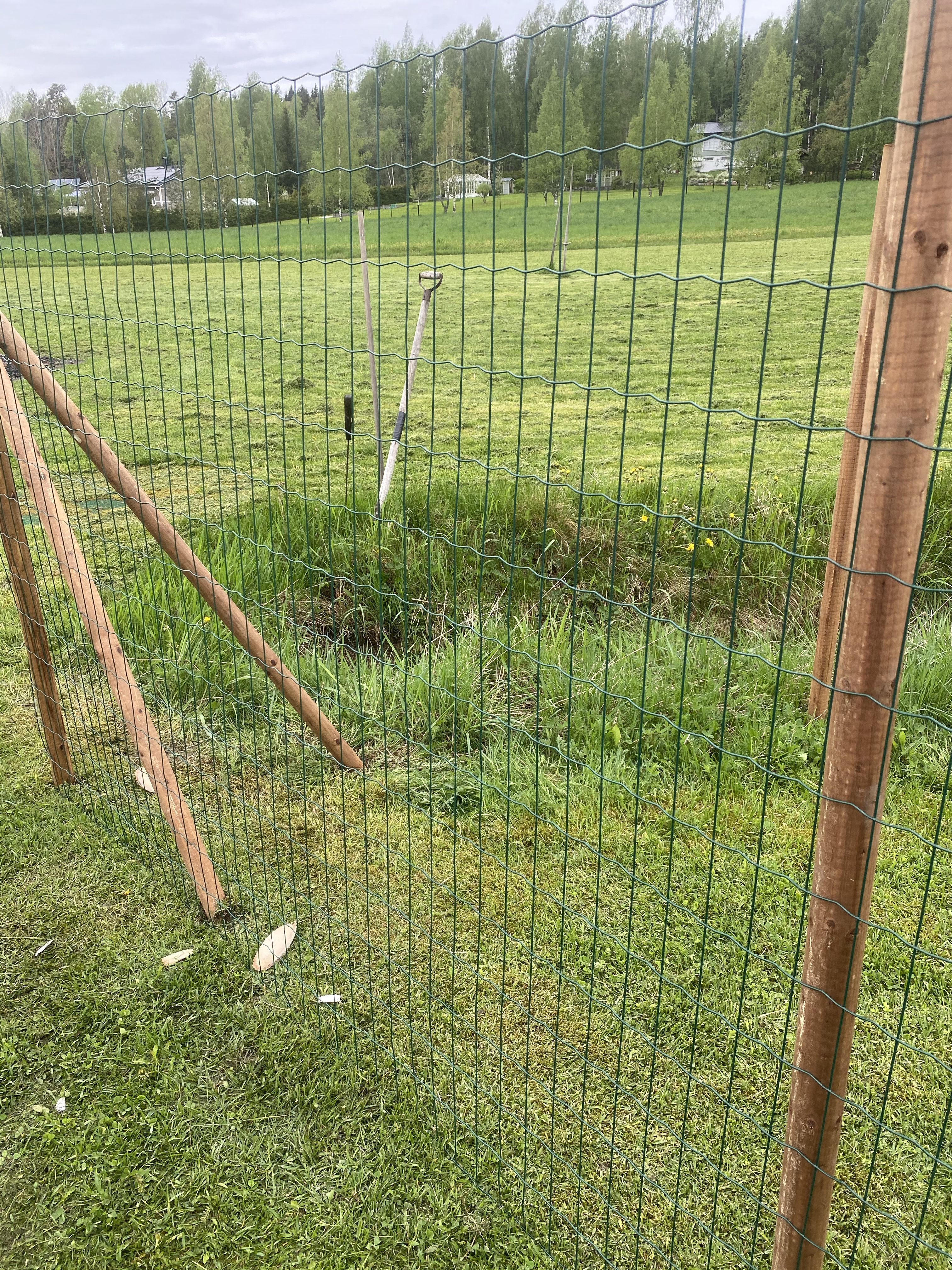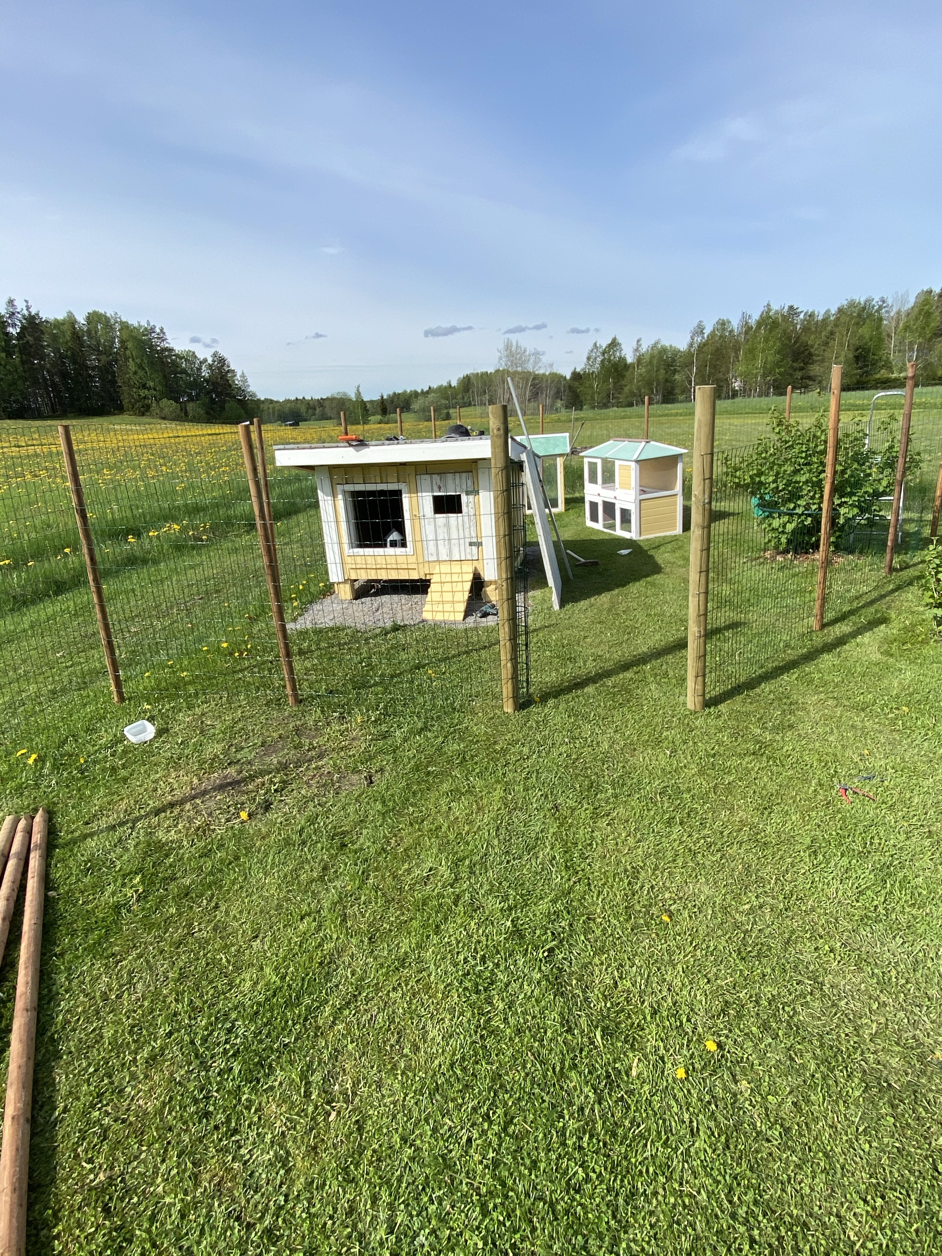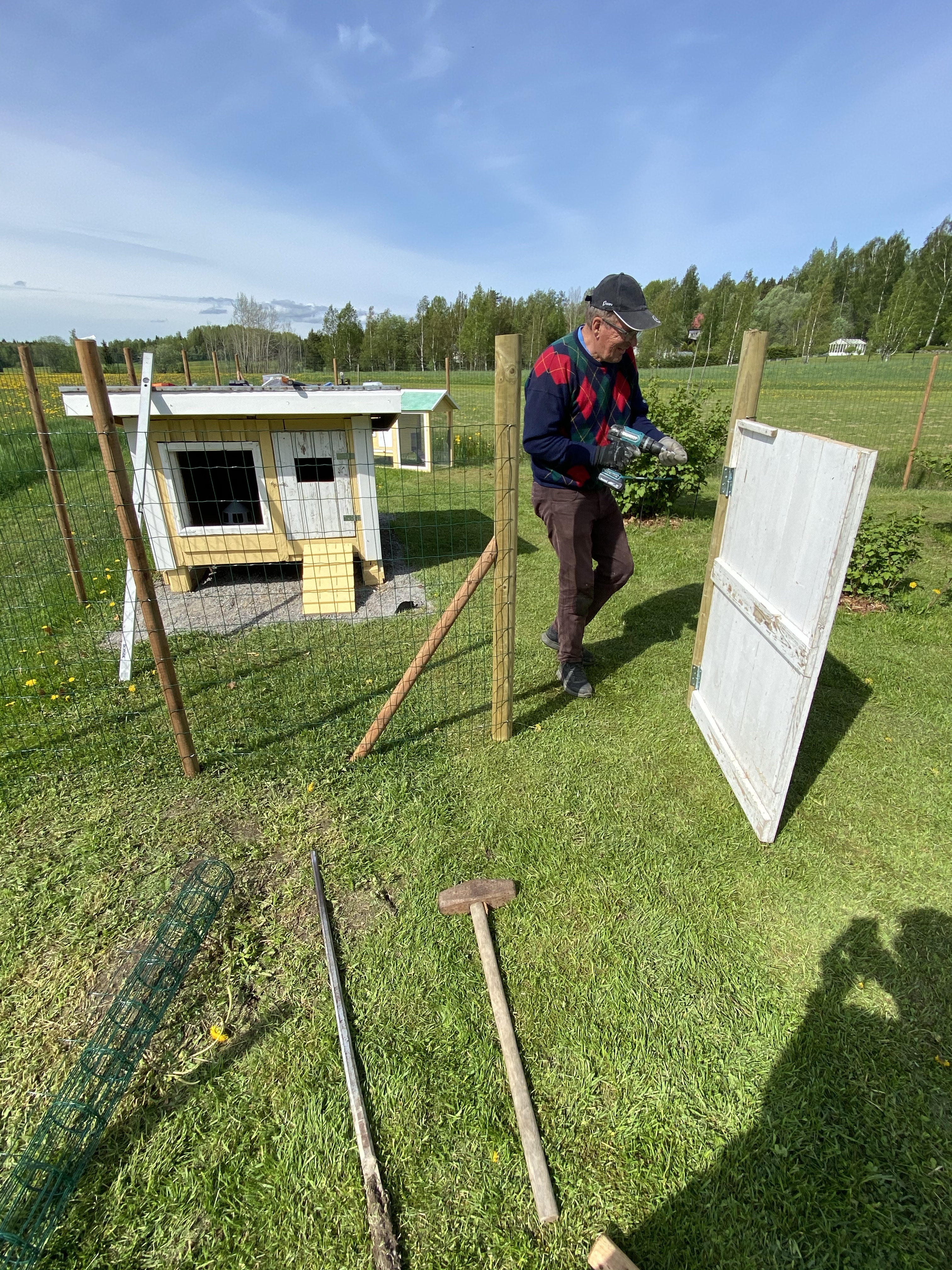Sedan blev det staket, för hit skall förutom höns också komma våra två kaniner, så det måste finnas en inhägnad. Jag och pappa hade bra samarbete och fick upp på en halv dag denna del, ännu är 1/3 ogjord eftersom vi skall ha täckdikning här hemma runt huset så måste den ännu vara ogjord så grävmaskinen kan åka där..